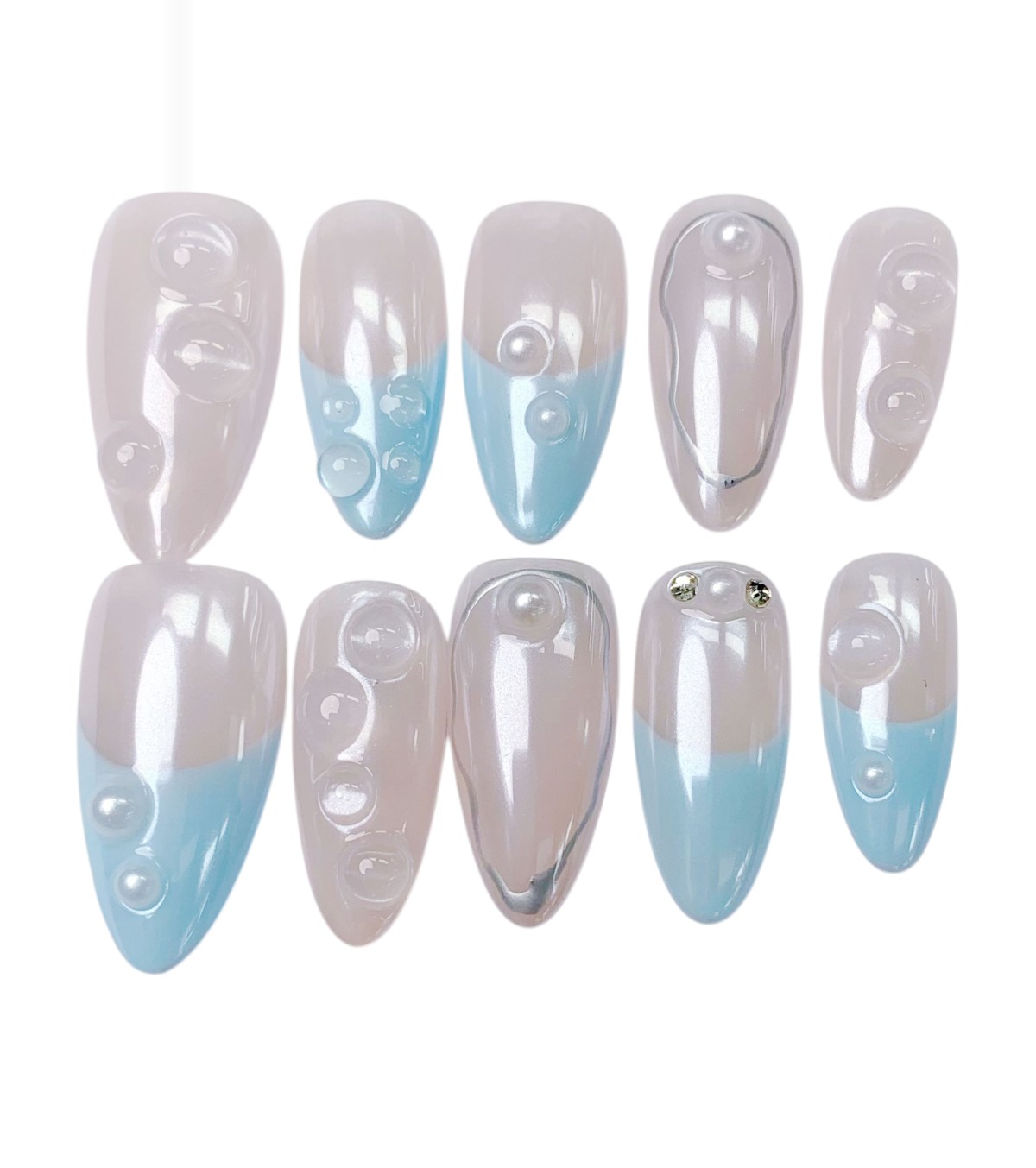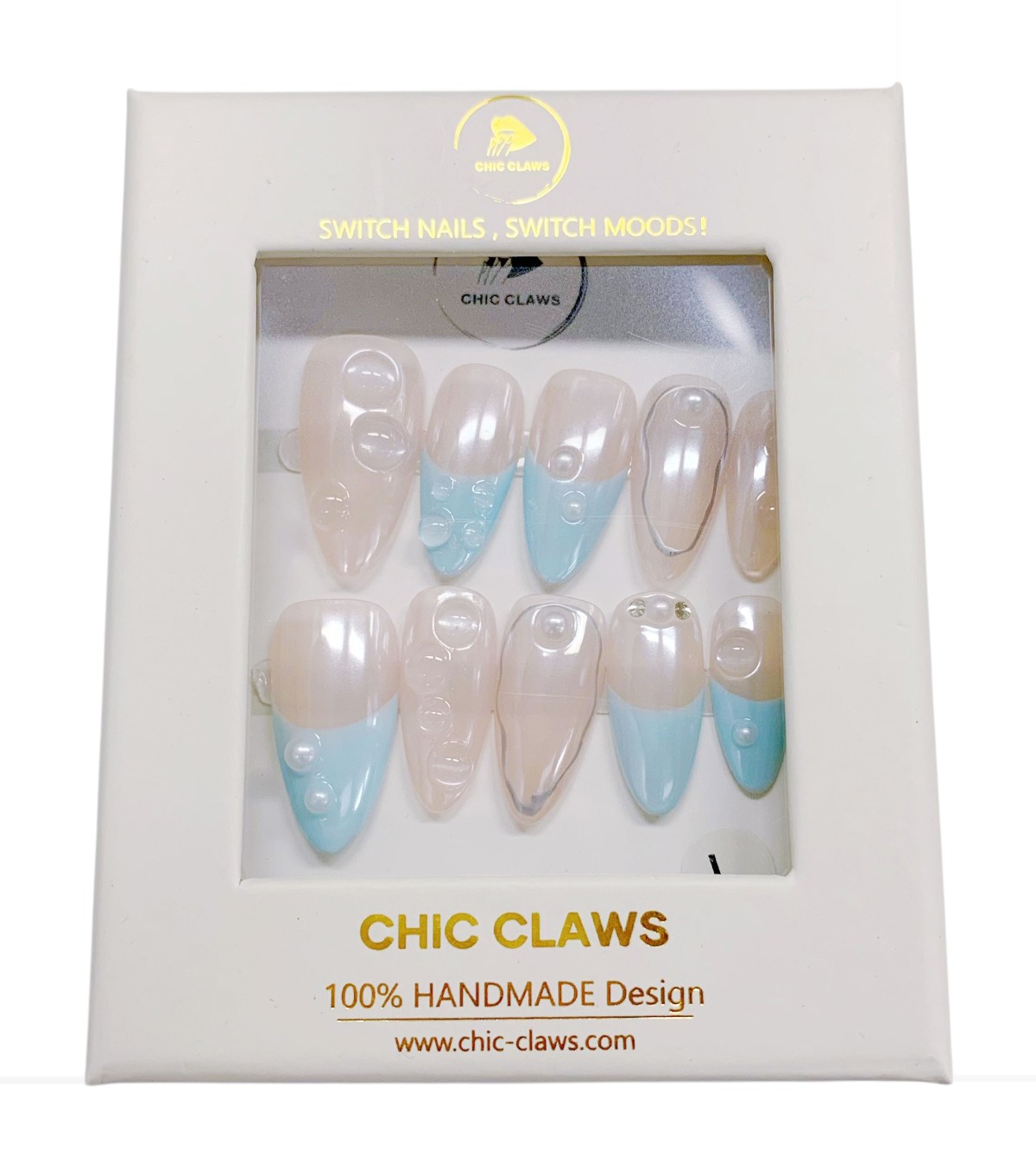 Mit Blue Bubble Dreams bringst du einen frischen und verspielten Look auf deine Nägel. Das zarte Blau kombiniert mit klaren Blaseneffekten verleiht deinem Style eine leichte, moderne Note – perfekt für den Sommer oder einen entspannten Strandtag.
