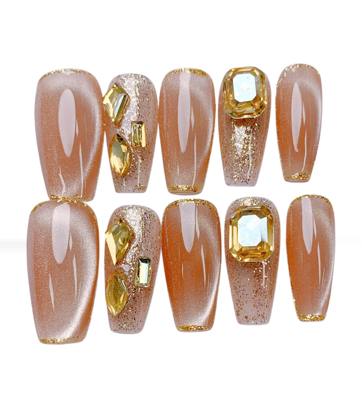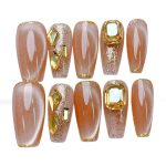 Mit dem Golden Elegance Nageldesign setzt du auf Luxus und Glamour. Die Kombination aus schimmerndem Nude-Ton und funkelnden Gold-Akzenten macht deine Nägel zu einem echten Blickfang – perfekt für festliche Anlässe und elegante Outfits.