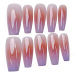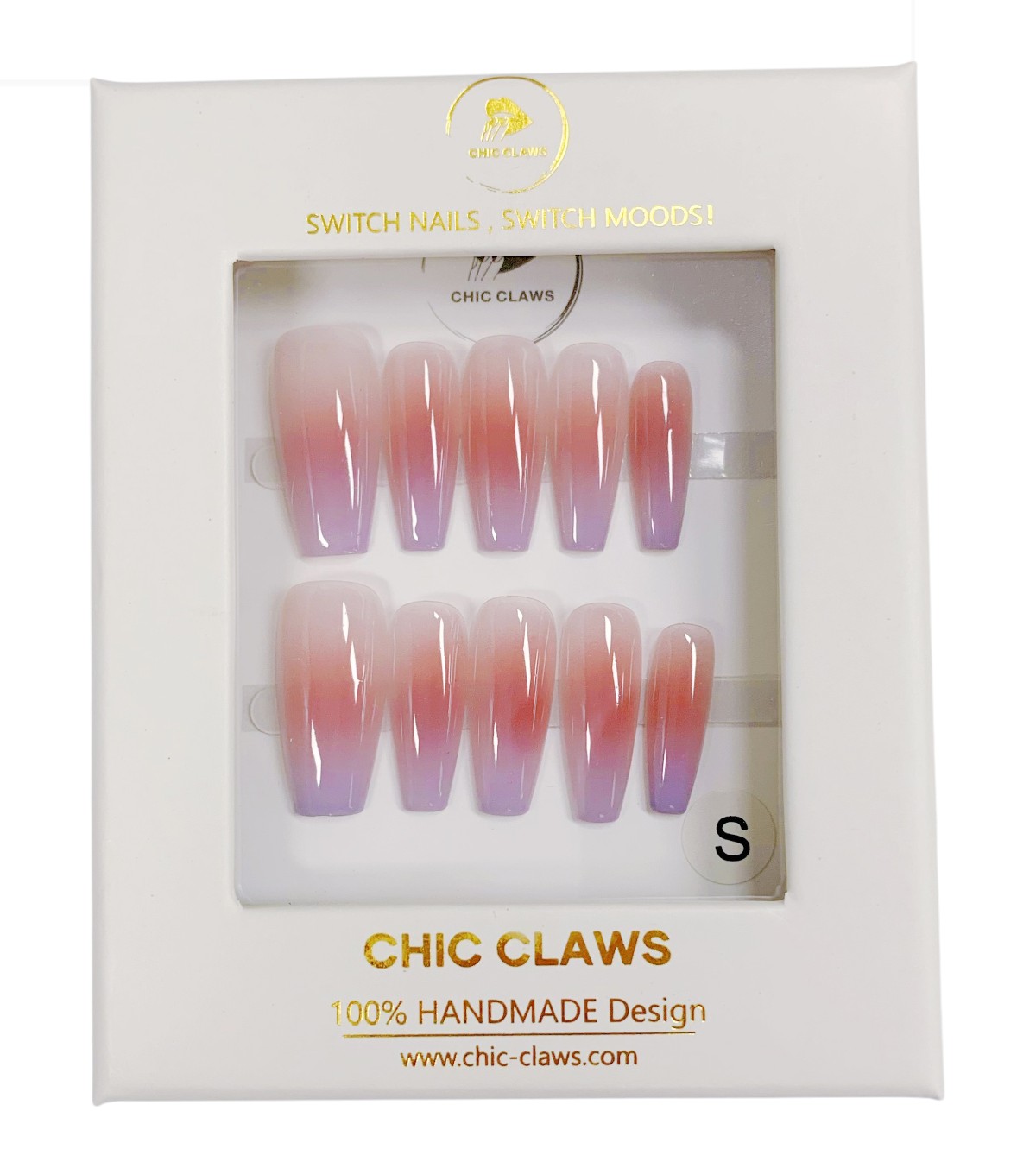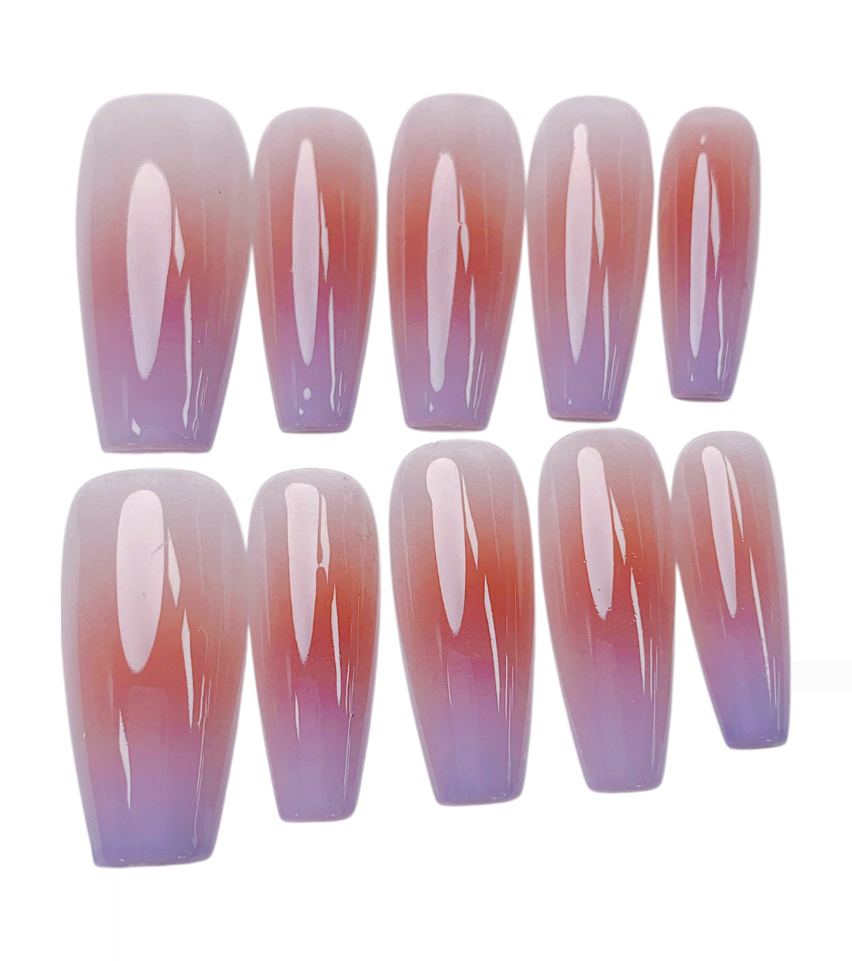 Das Sunset Glow Nageldesign verzaubert mit einem sanften Farbverlauf von warmem Orange zu zartem Lila – wie ein atemberaubender Sonnenuntergang auf deinen Nägeln. Perfekt für Sommerabende, Urlaubslooks oder für alle, die es stilvoll und modern lieben.
