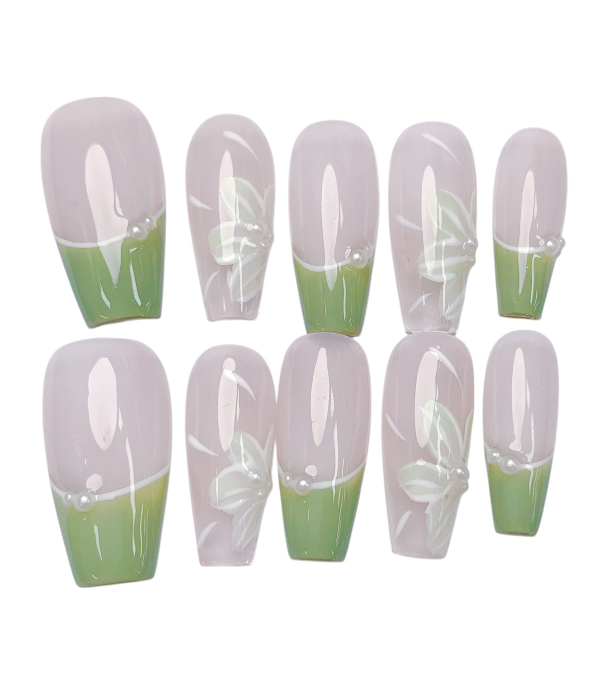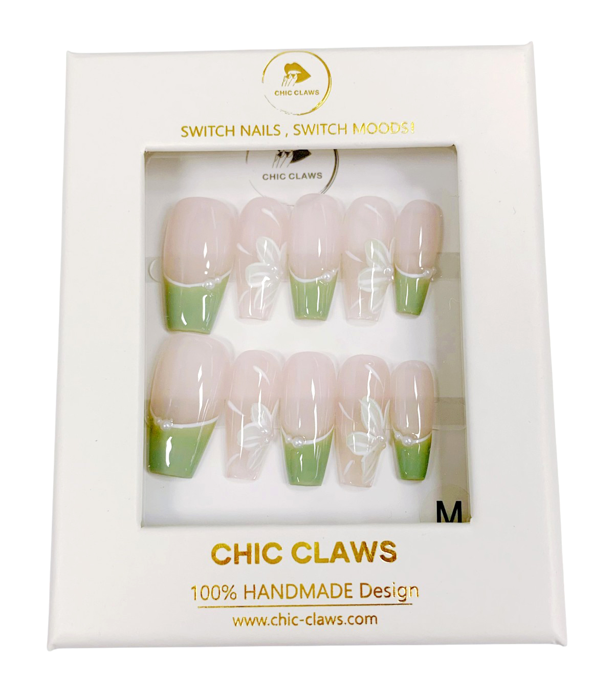 Das Spring Blossom Nageldesign bringt mit zarten Grün- und Nude-Tönen sowie feinen Blüten-Details frischen Wind in dein Styling. Ideal für alle, die natürliche Eleganz und einen frühlingshaften Look lieben.