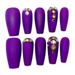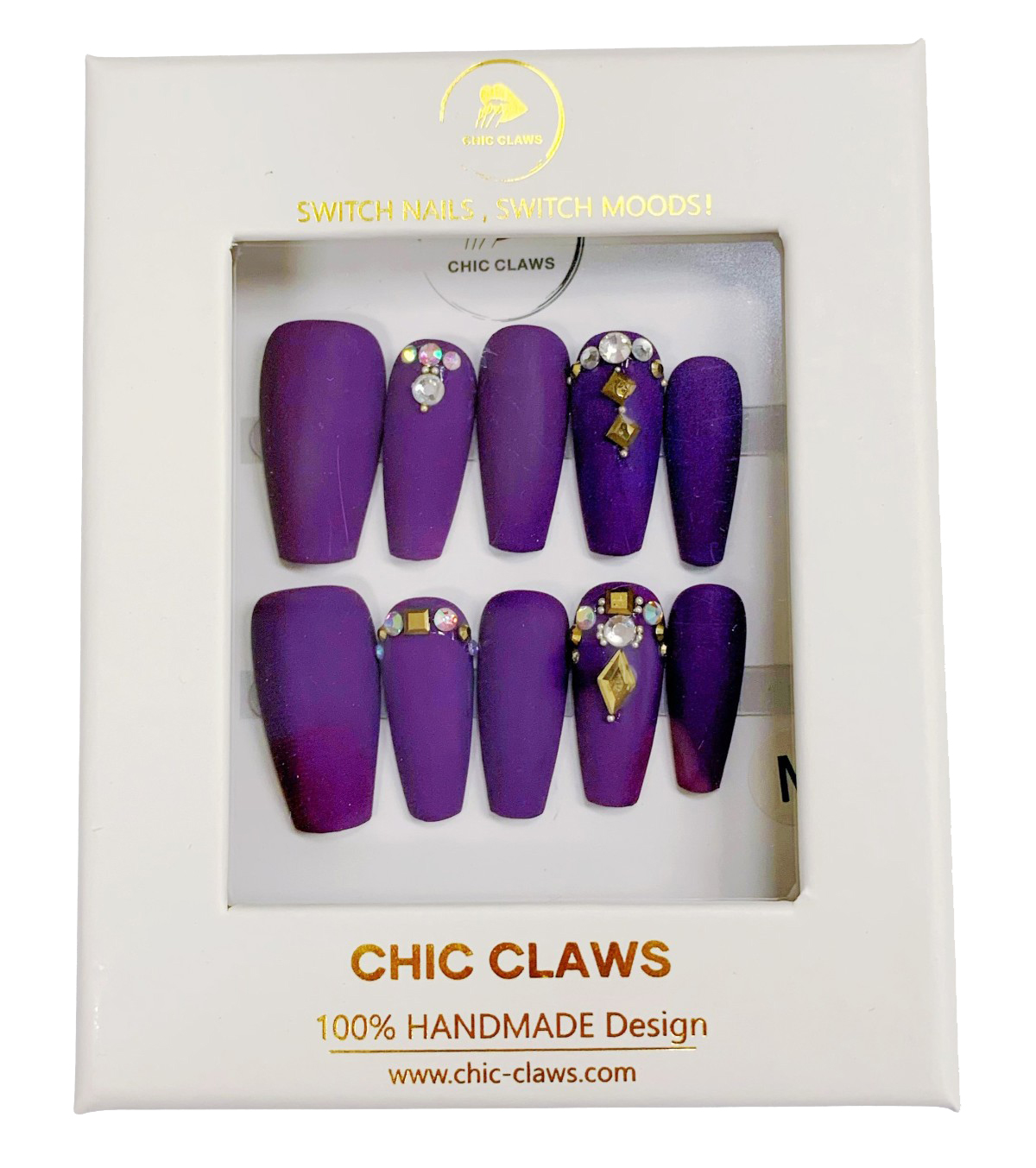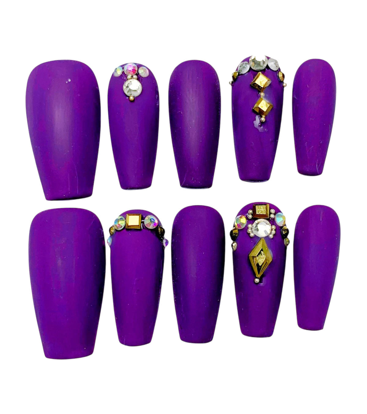 Mit Royal Glam bringst du Luxus und Eleganz auf deine Nägel. Das satte Violett kombiniert mit funkelnden Strasssteinen und goldenen Details sorgt für einen glamourösen Auftritt zu jedem Anlass.