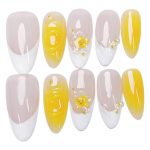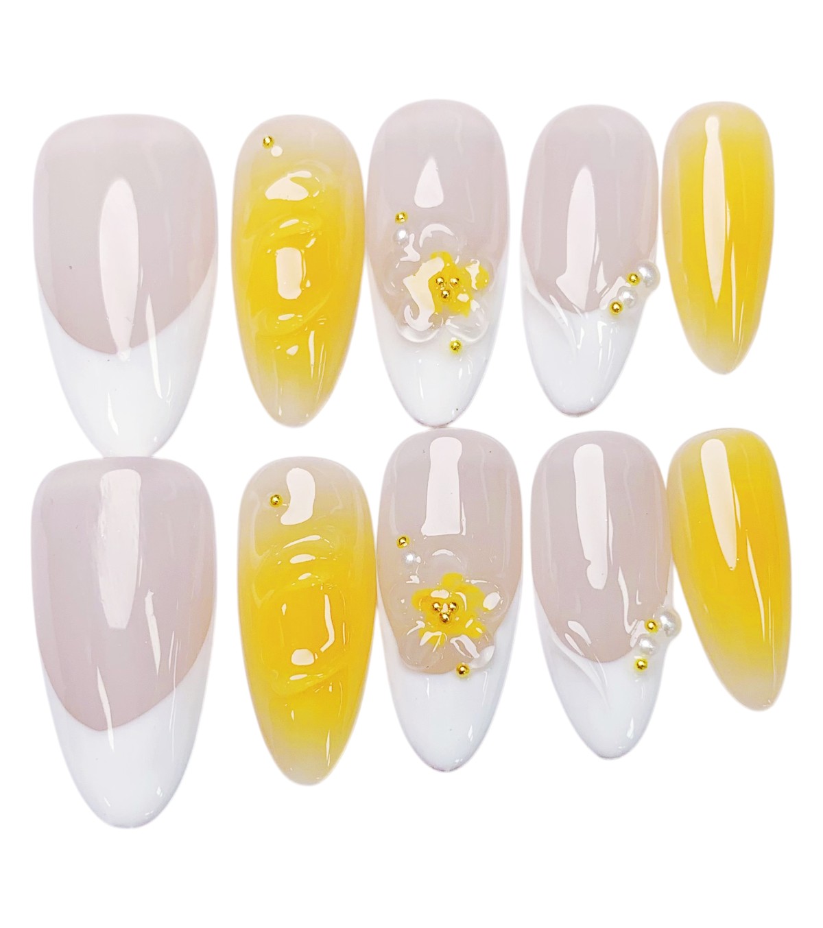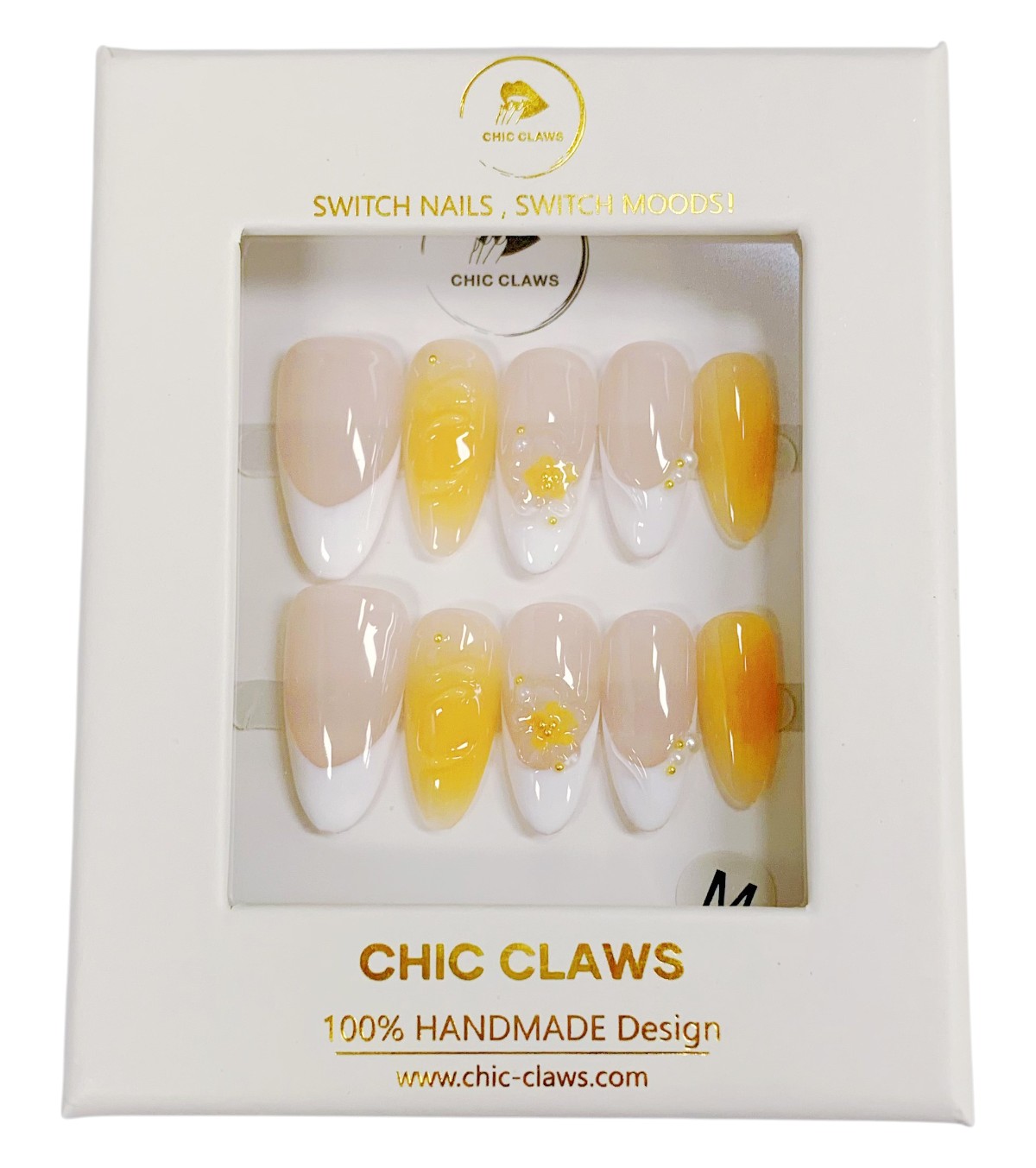 Mit Golden Sunrise holst du dir den Zauber eines sonnigen Morgens auf deine Nägel. Dieses handgefertigte Nageldesign kombiniert zartes Weiß mit leuchtendem Gelb und feinen Blüten-Details für einen frischen, fröhlichen Look.