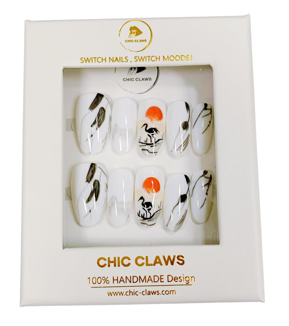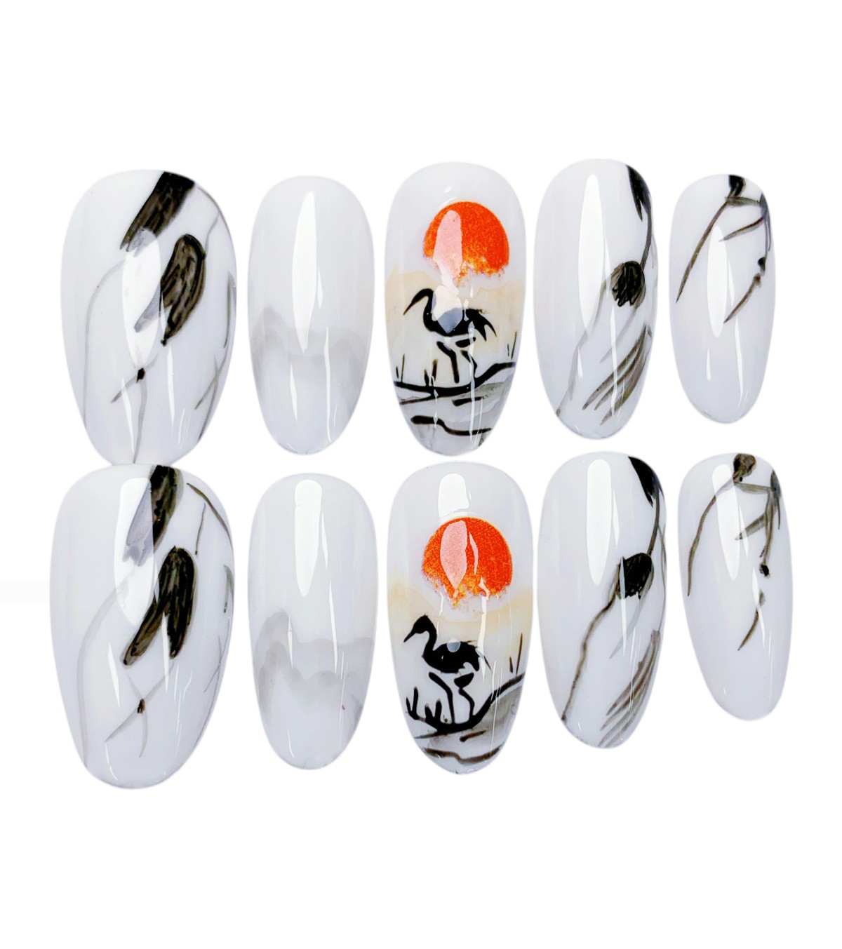 Das Sunset Crane Design bringt asiatische Kunst auf deine Nägel. Mit handgemalten Kranichen, Bambus und einer leuchtenden roten Sonne entsteht ein eleganter, künstlerischer Look für alle, die das Besondere lieben.