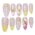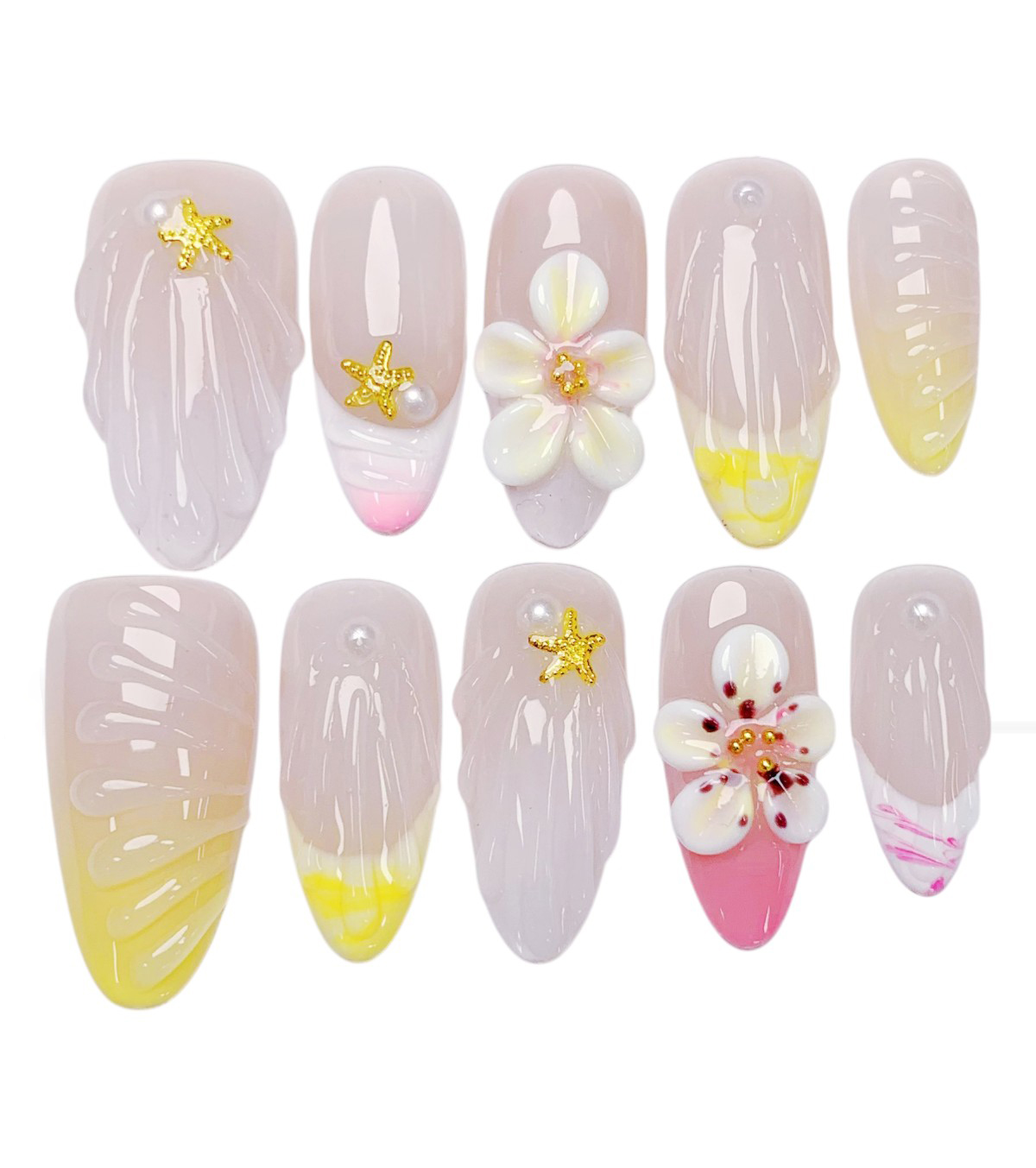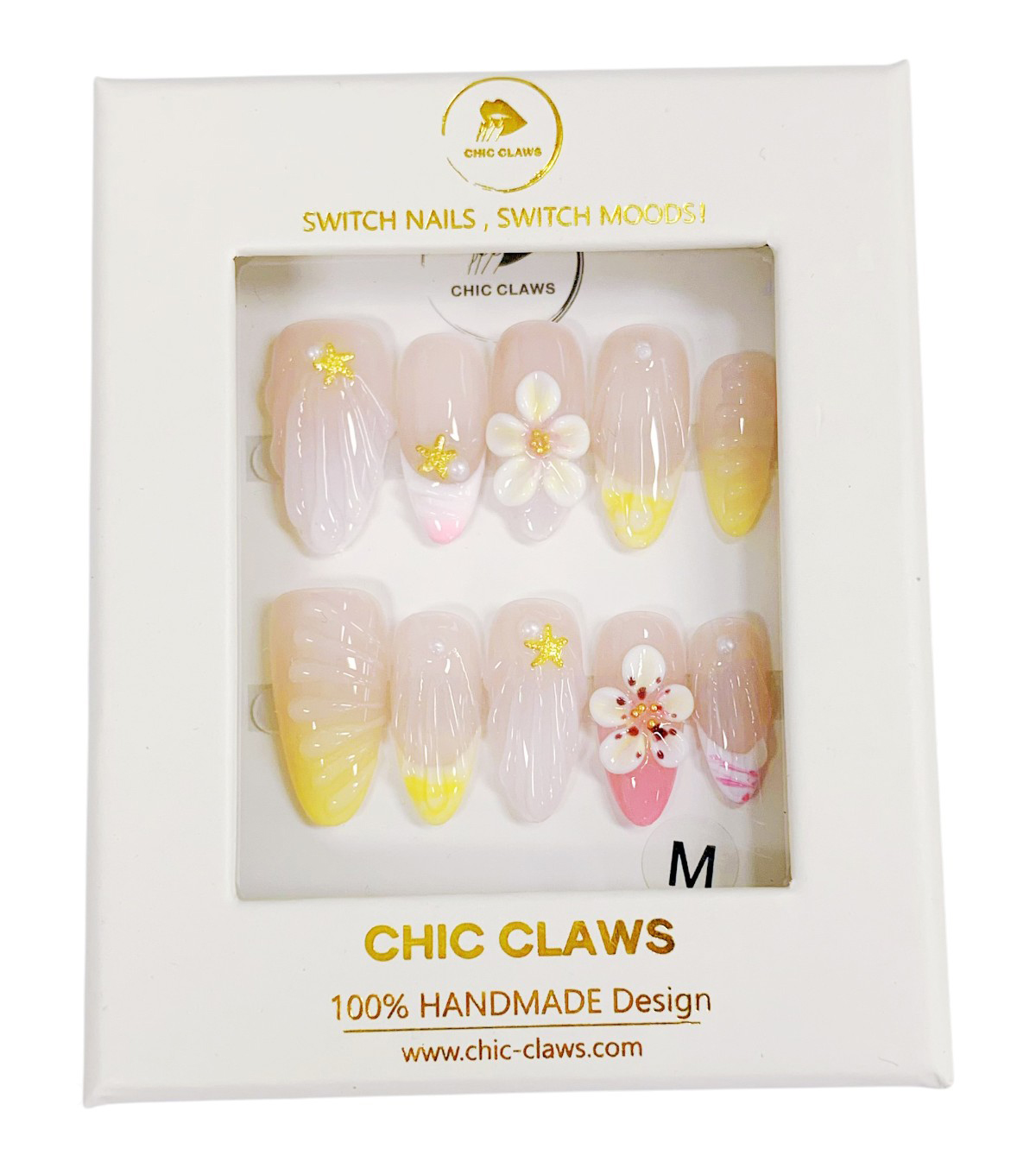 Hol dir den Sommer auf deine Nägel mit Sunset Paradise! Dieses handgefertigte Nageldesign kombiniert zarte Gelb- und Rosatöne mit liebevollen 3D-Blüten und funkelnden Sternendetails, die an einen traumhaften Sonnenuntergang am Meer erinnern.