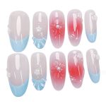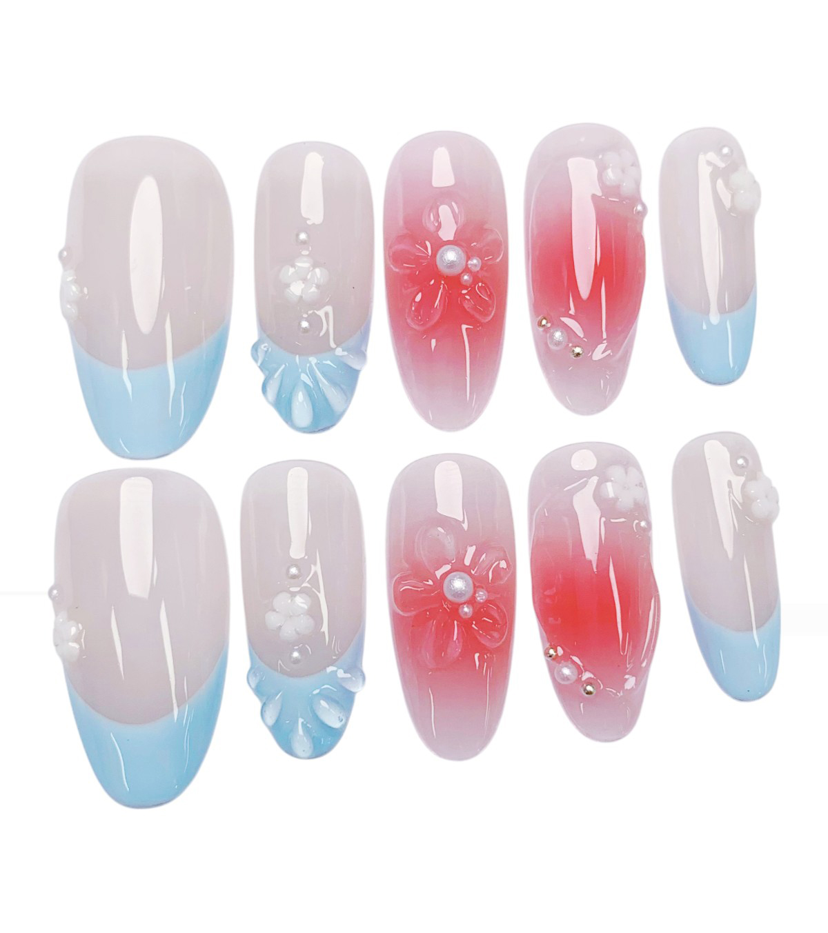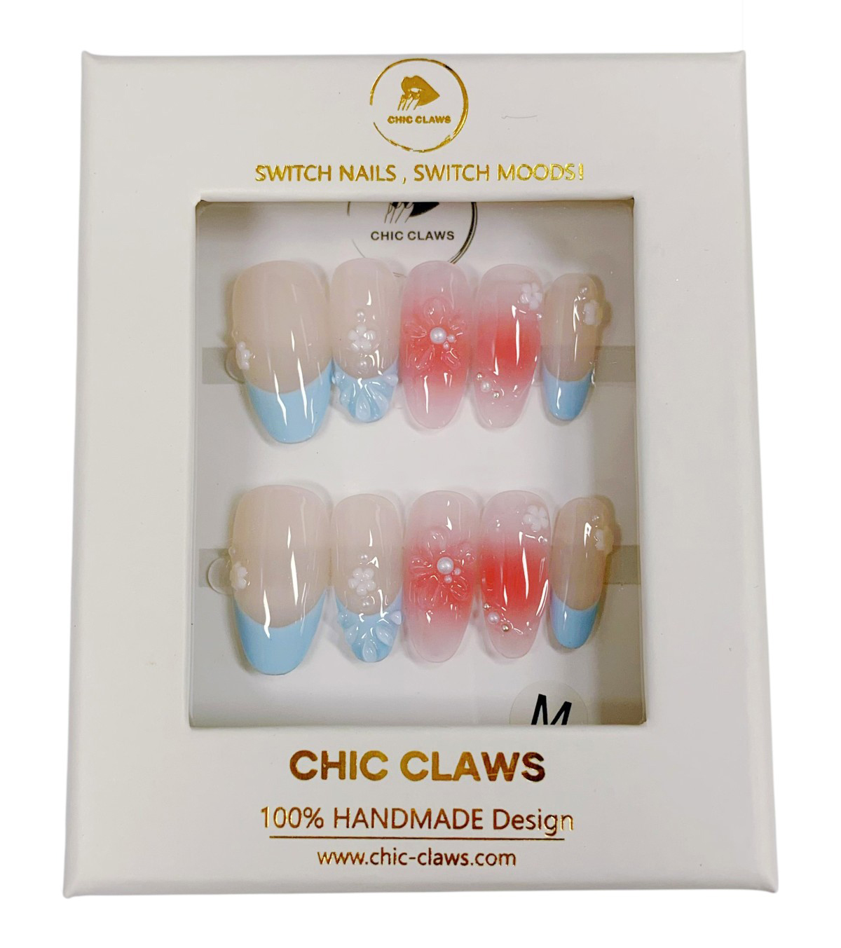 Mit Blossom Breeze bringst du Frühlingsfrische auf deine Nägel. Zarte Blautöne kombiniert mit 3D-Blumen und Perlen schaffen einen verspielten und gleichzeitig eleganten Look – ideal für den Alltag oder besondere Anlässe.
