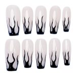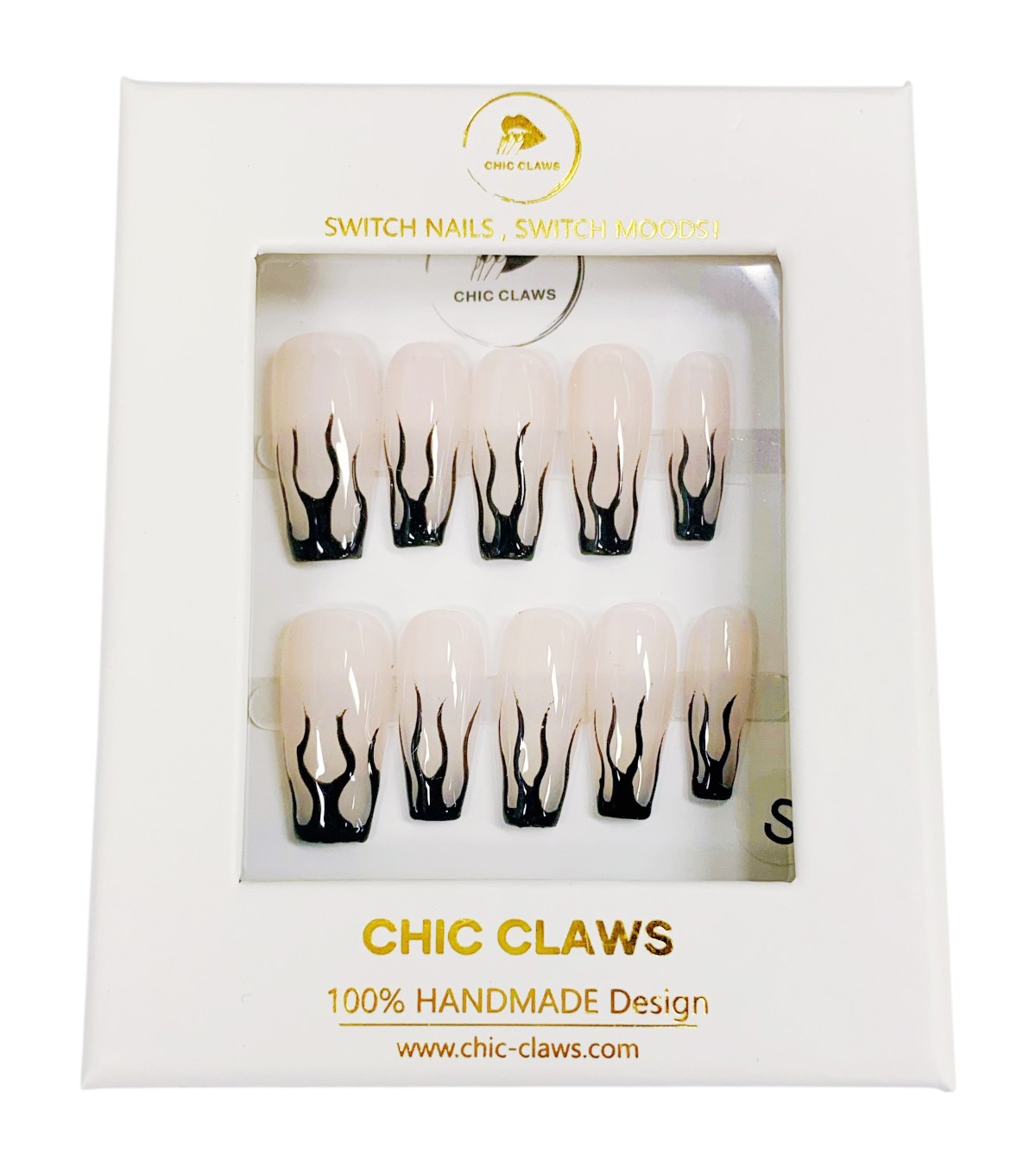 Mit dem Black Flame Nageldesign setzt du ein starkes Style-Statement. Die zarten schwarzen Flammen auf transparentem Untergrund verleihen deinen Nägeln einen mysteriösen und trendigen Look, der sowohl für Partys als auch den Alltag perfekt geeignet ist.