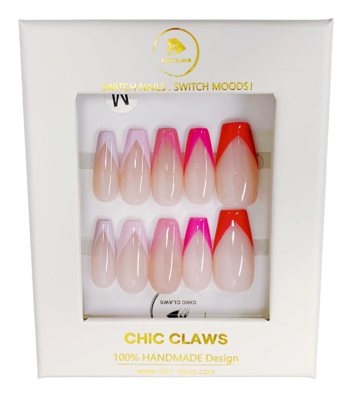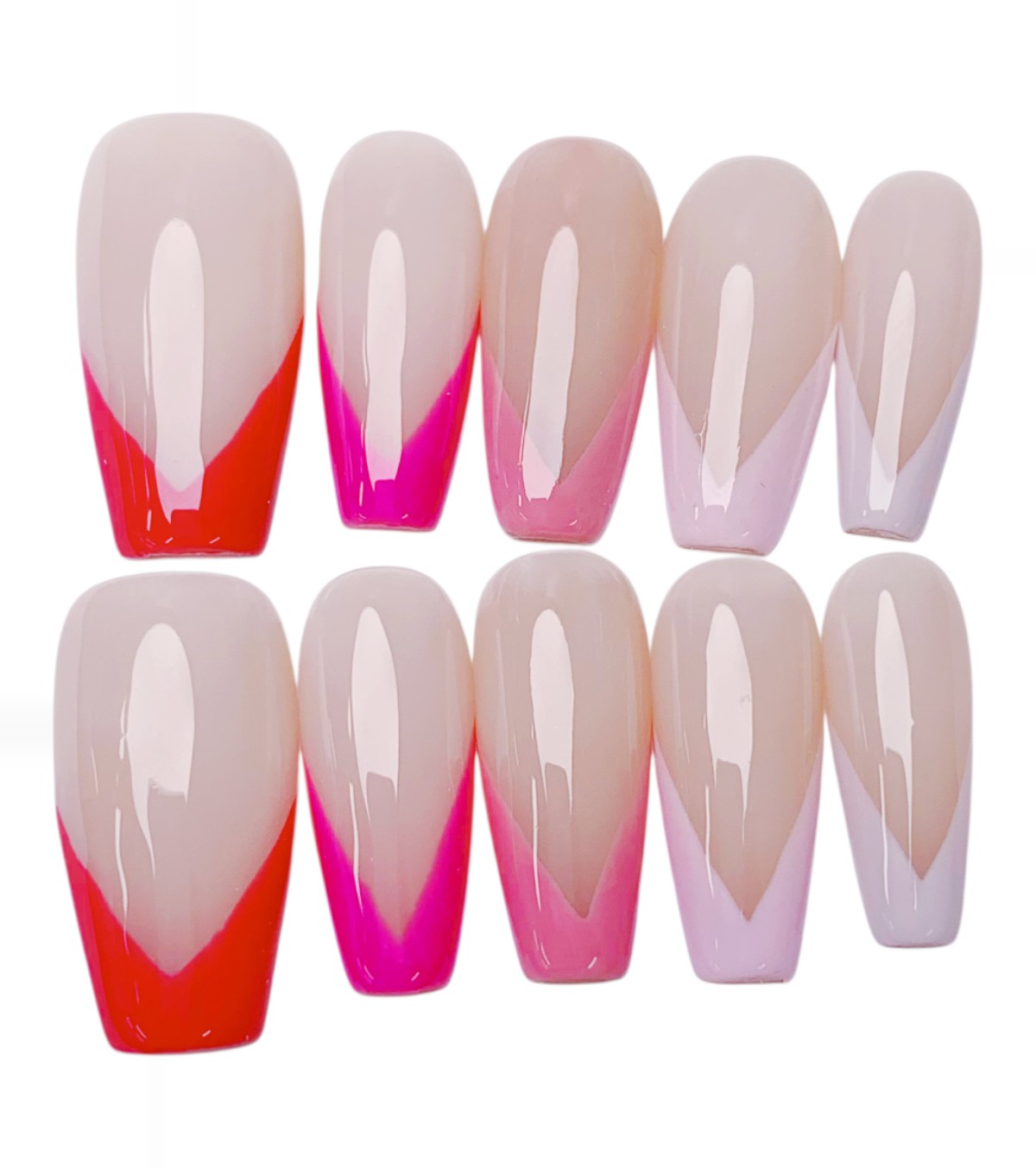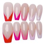 Mit den handgefertigten Bold French Press-on Nails bringst du frischen Wind in den klassischen French-Style. Kräftige Farbakzente in Pink und Rot machen deine Nägel zum Hingucker – elegant, modern und super einfach anzuwenden.