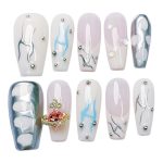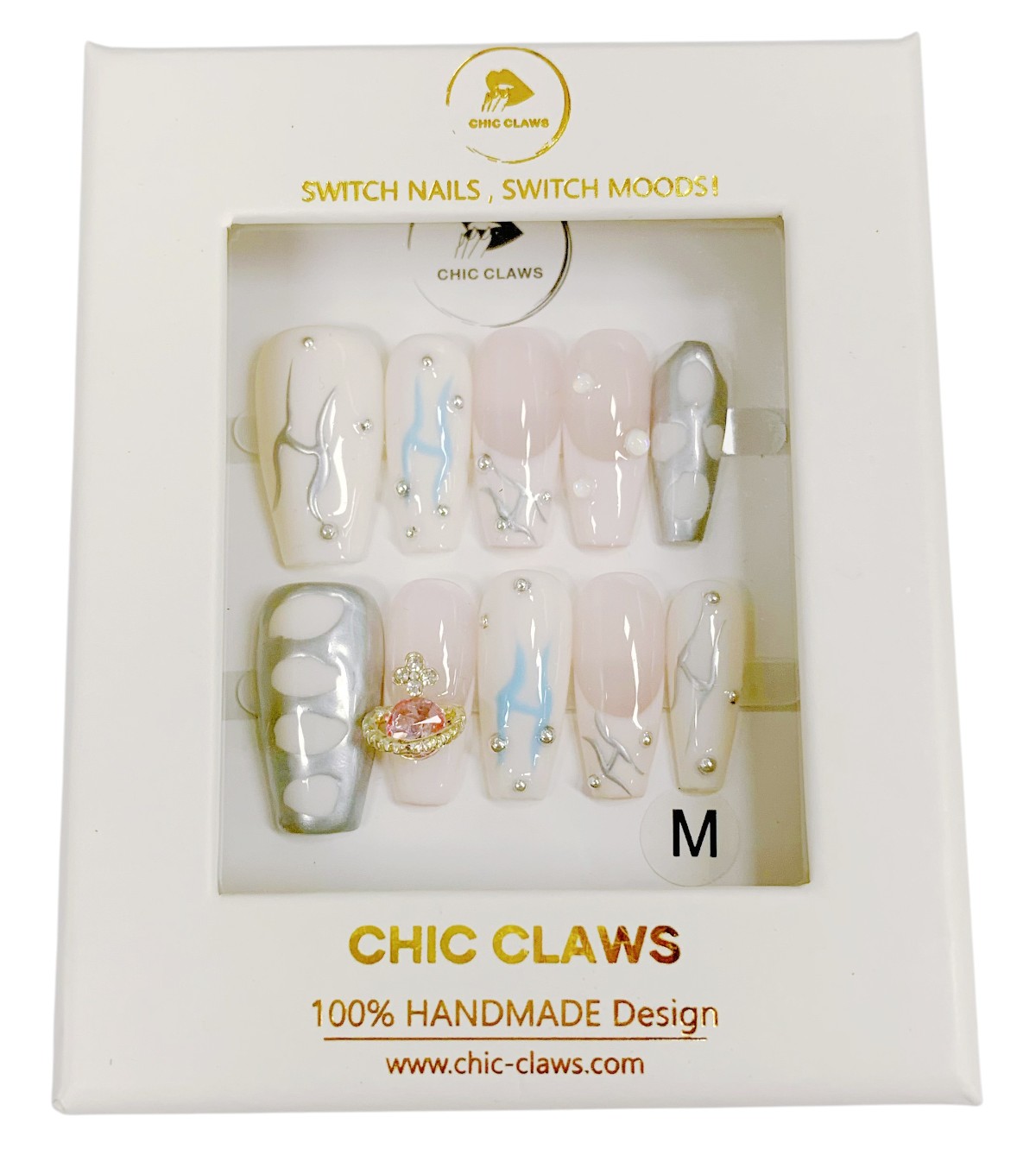 Mit dem Galaxy Vibes Nageldesign holst du dir den Kosmos auf deine Nägel. Die Kombination aus schimmernden Metallic-Linien, zarten Pastellakzenten und funkelnden Strasssteinen verleiht diesem Design einen modernen, futuristischen Look. Ein besonderer Hingucker ist das dezente Planeten-Emblem, das den Space-Vibe perfekt macht.