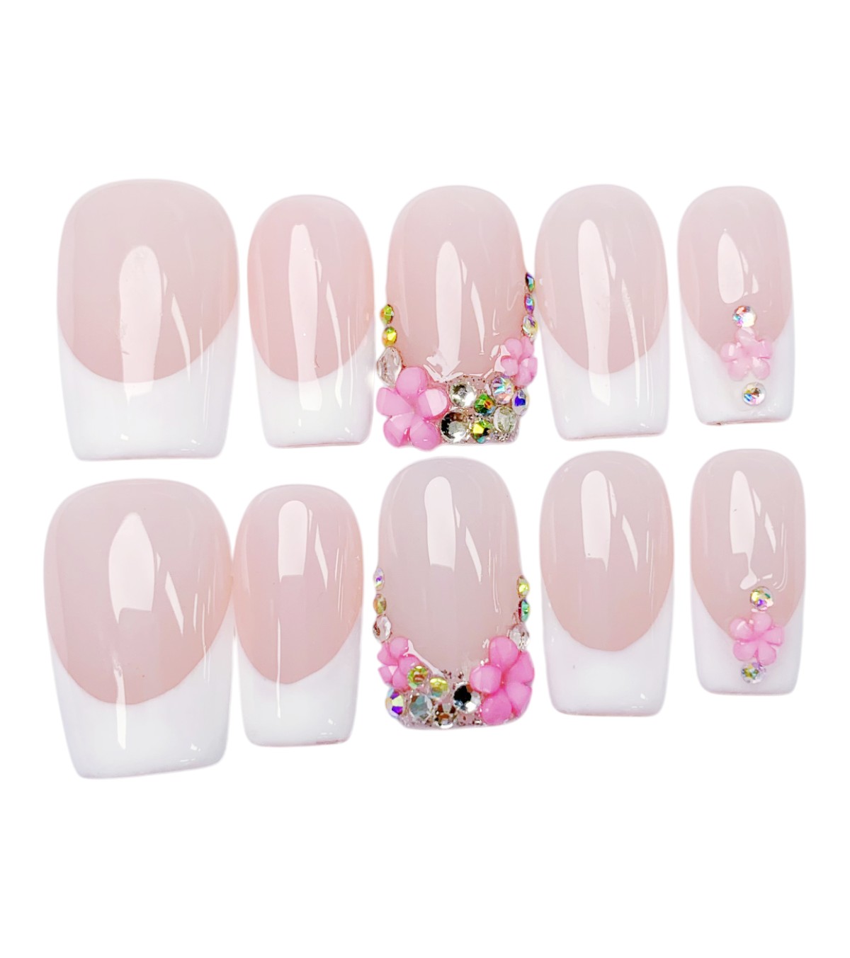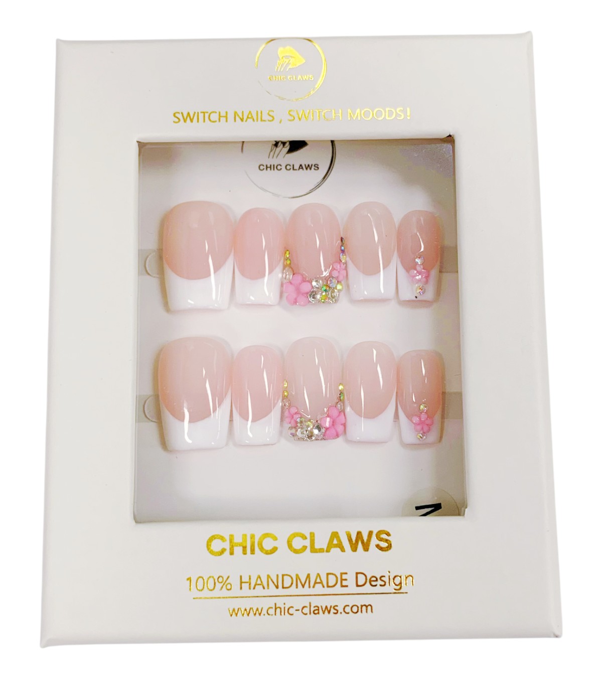 Die Blossom French Press-on Nails bringen frühlingshafte Romantik auf deine Nägel. Zarte Blüten, kombiniert mit funkelnden Akzenten, verleihen dem klassischen French-Design eine moderne, feminine Note.