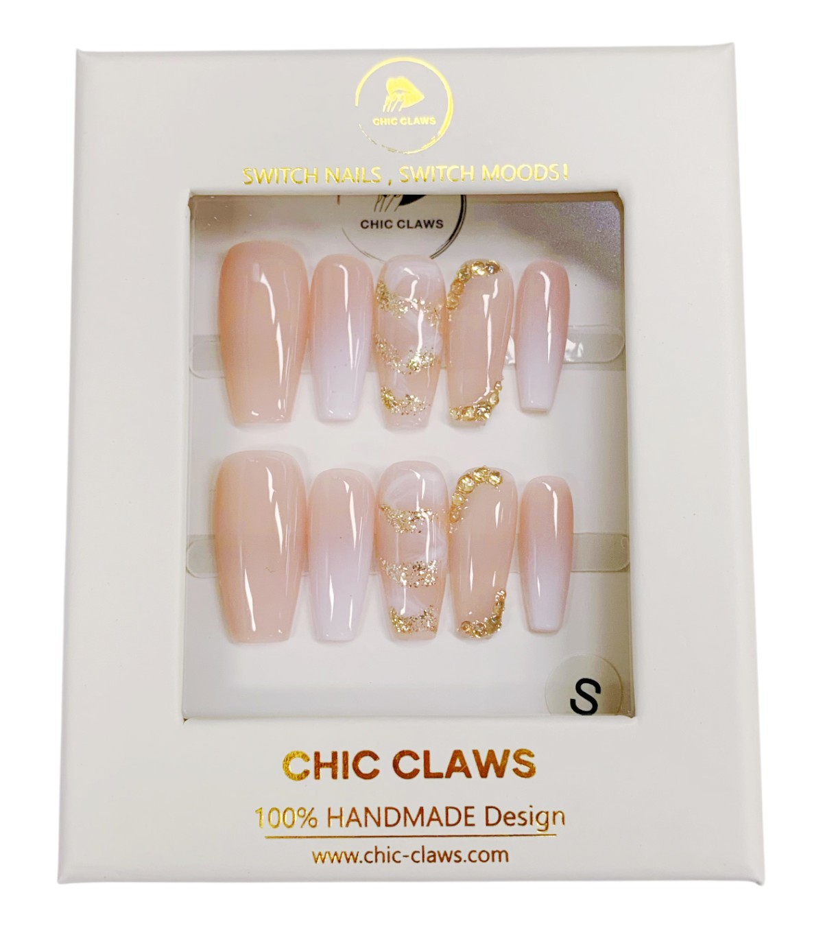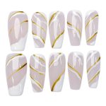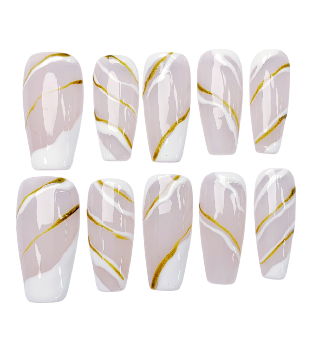 Mit dem Golden Marble Elegance Nageldesign holst du dir luxuriöse Marble-Nägel mit feinen goldenen Akzenten. Das dezente Nude mit den eleganten Linien sorgt für einen stilvollen und zeitlosen Look – perfekt für besondere Anlässe oder den Alltag mit einem Hauch von Glamour.