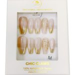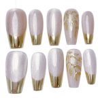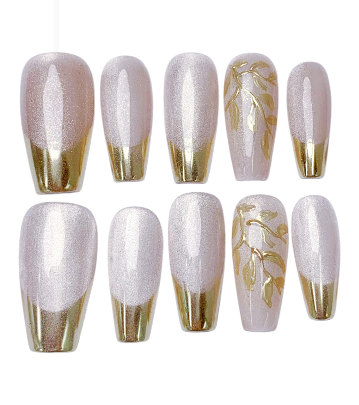 Das elegante Design mit goldenen Akzenten und zarten Blattmustern bringt pure Eleganz auf deine Nägel – ohne den Stress eines Nagelstudios.