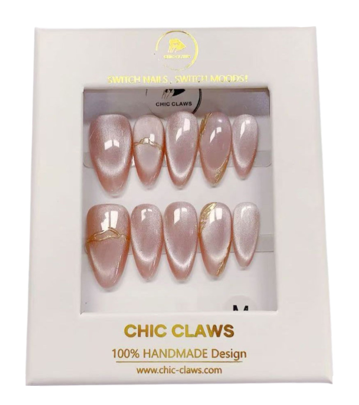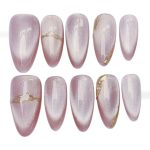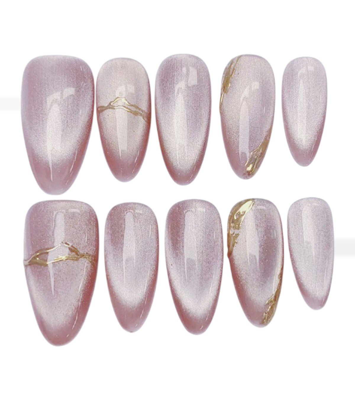 Das Rose Marble Shine Nageldesign kombiniert zarten Rosé-Schimmer mit feinen Marmor-Details in Gold. Diese Press-on Nägel wirken elegant und modern zugleich – perfekt für Business-Looks oder romantische Anlässe.