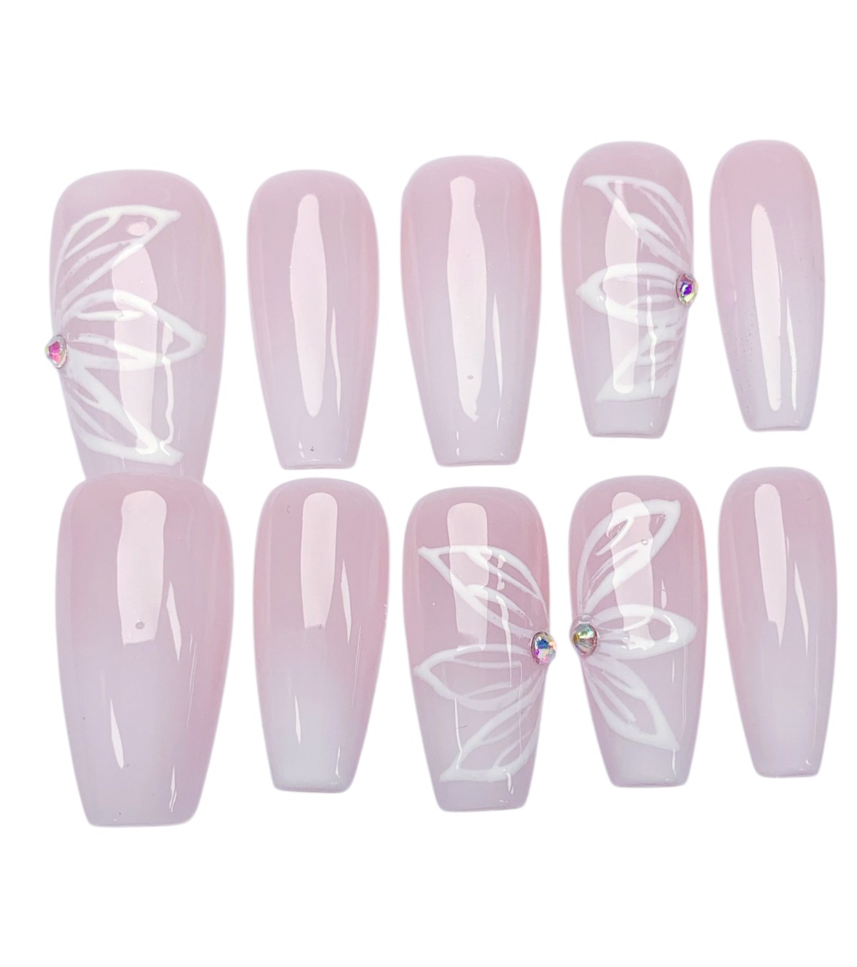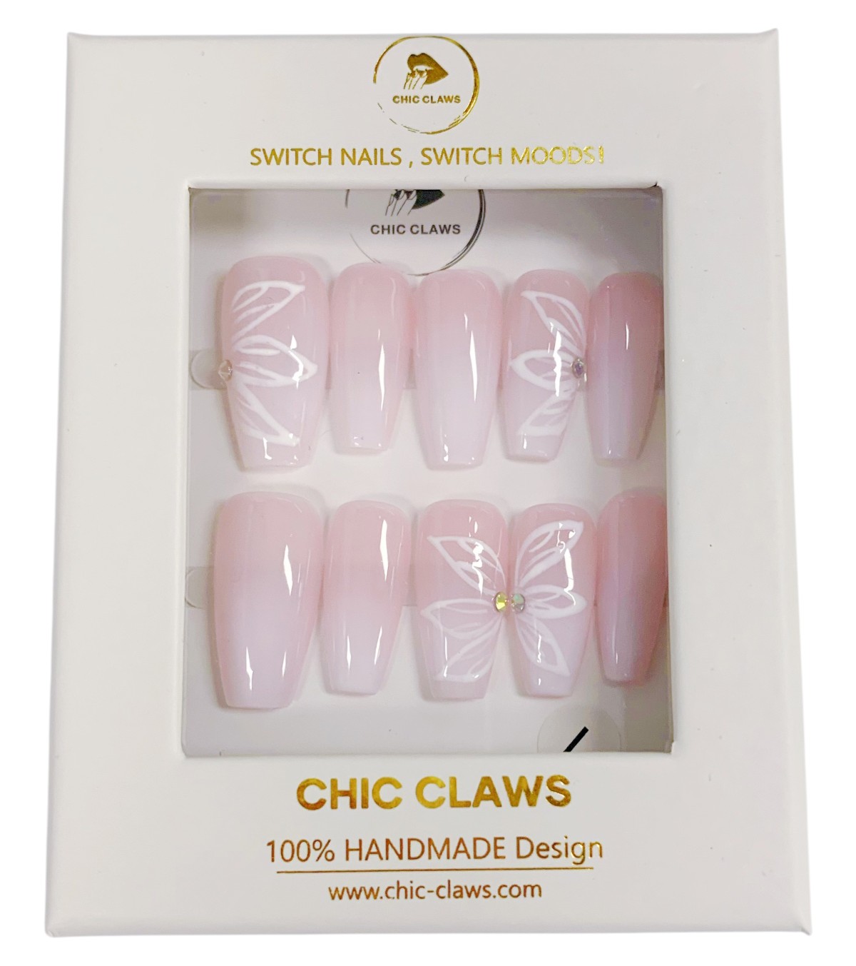 Erlebe die zarte Eleganz von Crystal Butterfly Dreams, unserem handgefertigten Nageldesign, das mit feinen Schmetterlingsflügeln und funkelnden Kristallsteinen verziert ist. Das sanfte Rosé-Finish verleiht deinen Nägeln einen romantischen und femininen Look, perfekt für besondere Anlässe oder den Alltag.