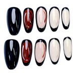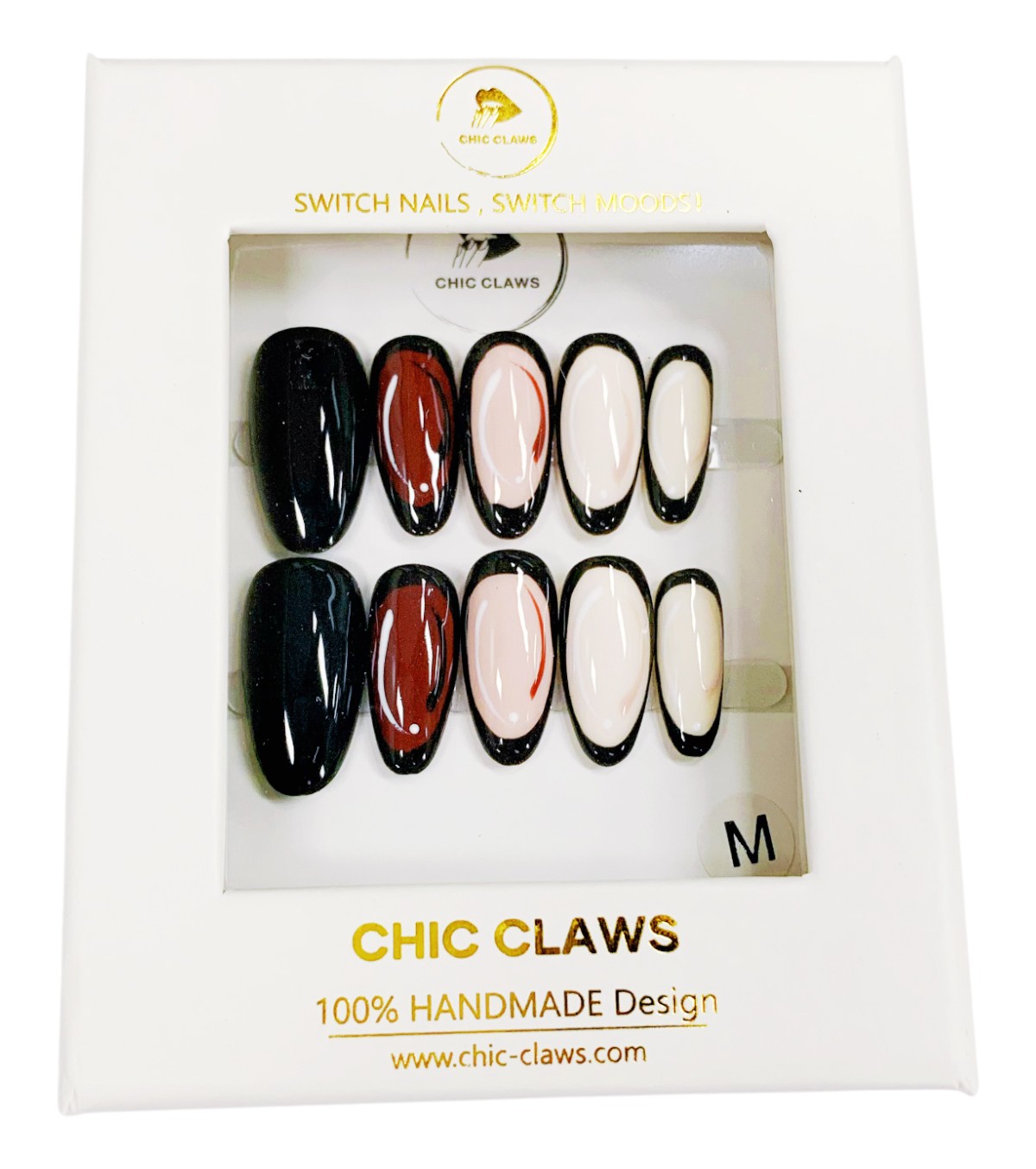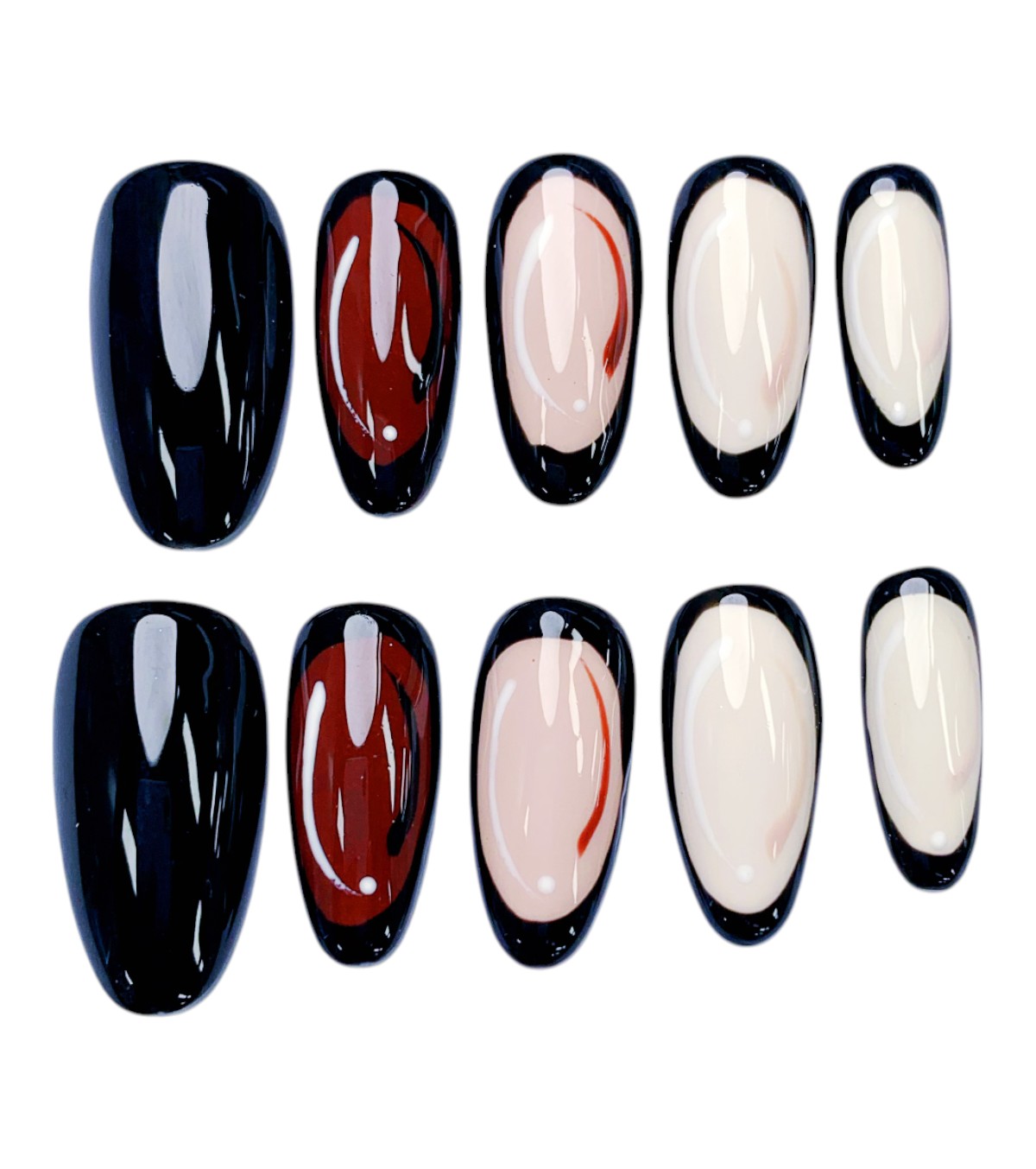 Die Midnight Elegance Nails vereinen tiefe, dunkle Töne mit subtilen Nude- und Rotdetails. Das Design ist sophisticated und gleichzeitig ausdrucksstark, ideal für einen glamourösen Auftritt.