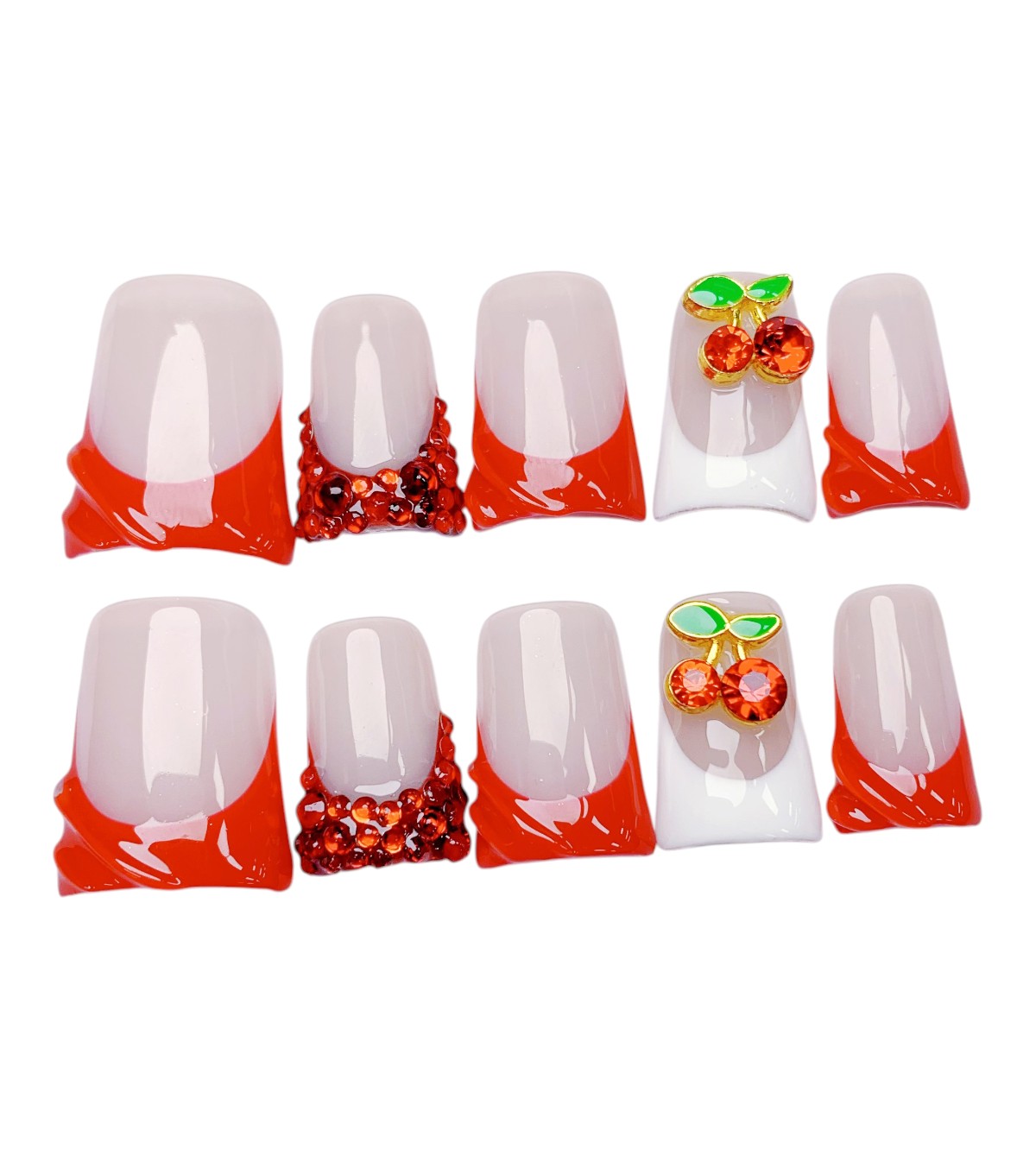 Die Cherry Glam Nails bringen Farbe und Spaß auf deine Fingerspitzen. Mit leuchtendem Rot, verspielten Kirsch-Applikationen und funkelnden Steinchen sind sie ein echter Hingucker.