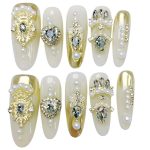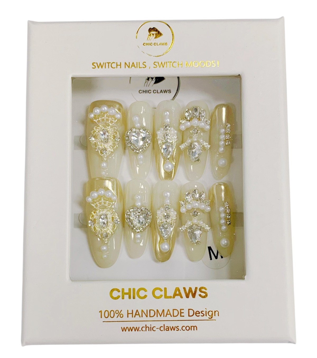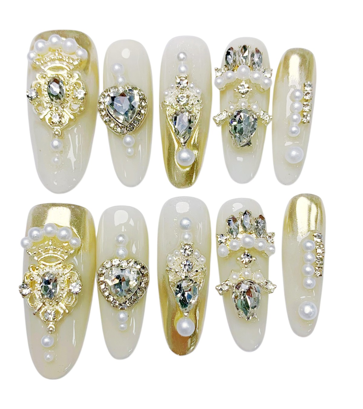 Die Royal Glam Nails bringen königlichen Glanz auf deine Fingerspitzen. Mit goldenen Details, funkelnden Strasssteinen und edlen Perlen sind sie perfekt für glamouröse Auftritte.