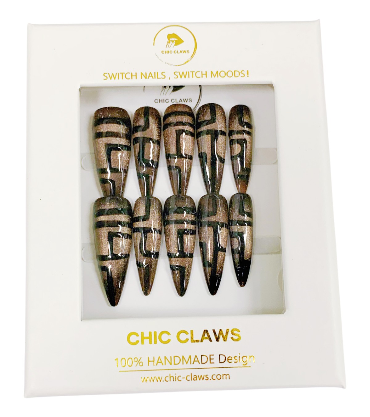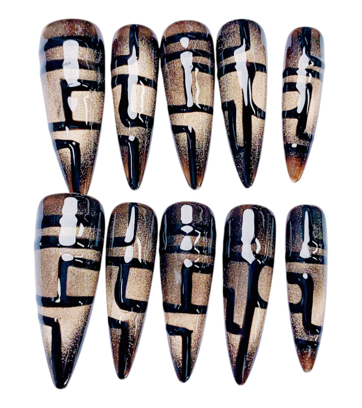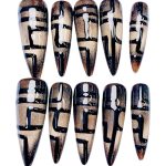 Die Urban Geometry Nails kombinieren den warmen Schimmer von Bronze mit einem kühlen, schwarzen Liniendesign. Ein Look, inspiriert von Großstadtlichtern und moderner Kunst – perfekt für Fashionistas mit einem Hang zu Extravaganz und Stil.