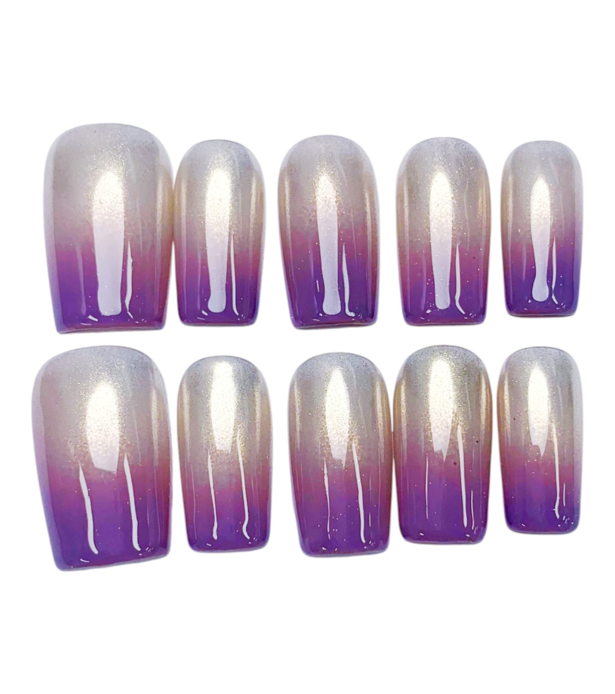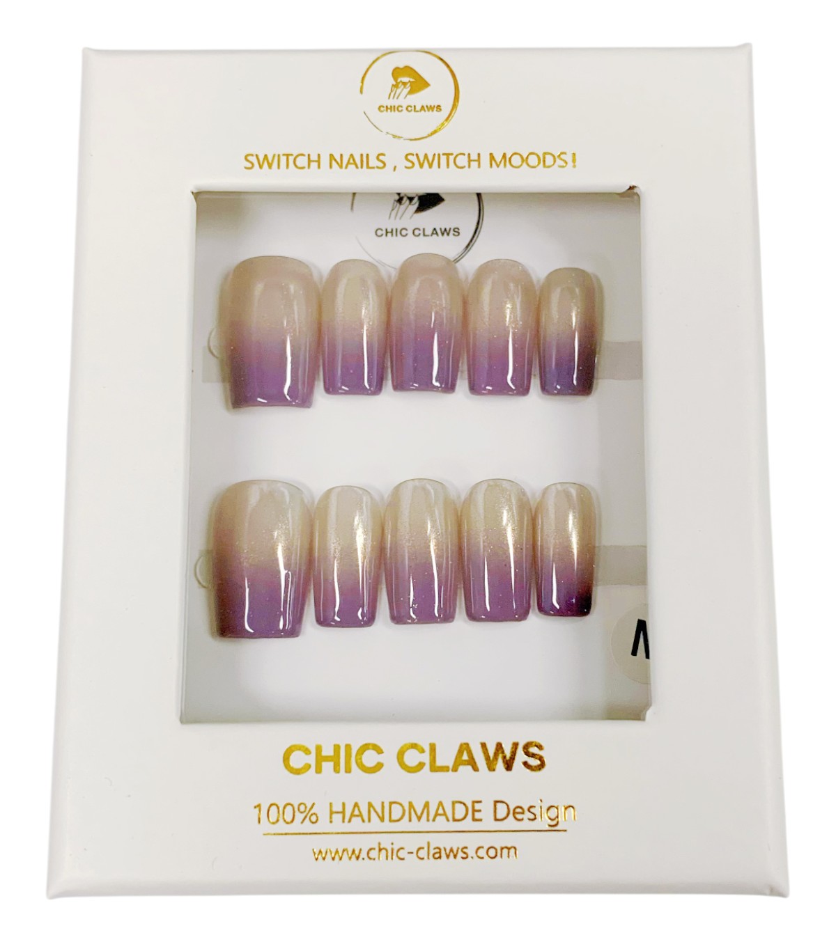 Die Mystic Twilight Nails verzaubern mit einem traumhaften Farbverlauf von schimmerndem Champagner zu geheimnisvollem Violett. Ein Design, das Luxus und Raffinesse perfekt kombiniert.