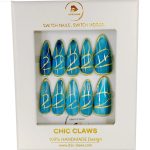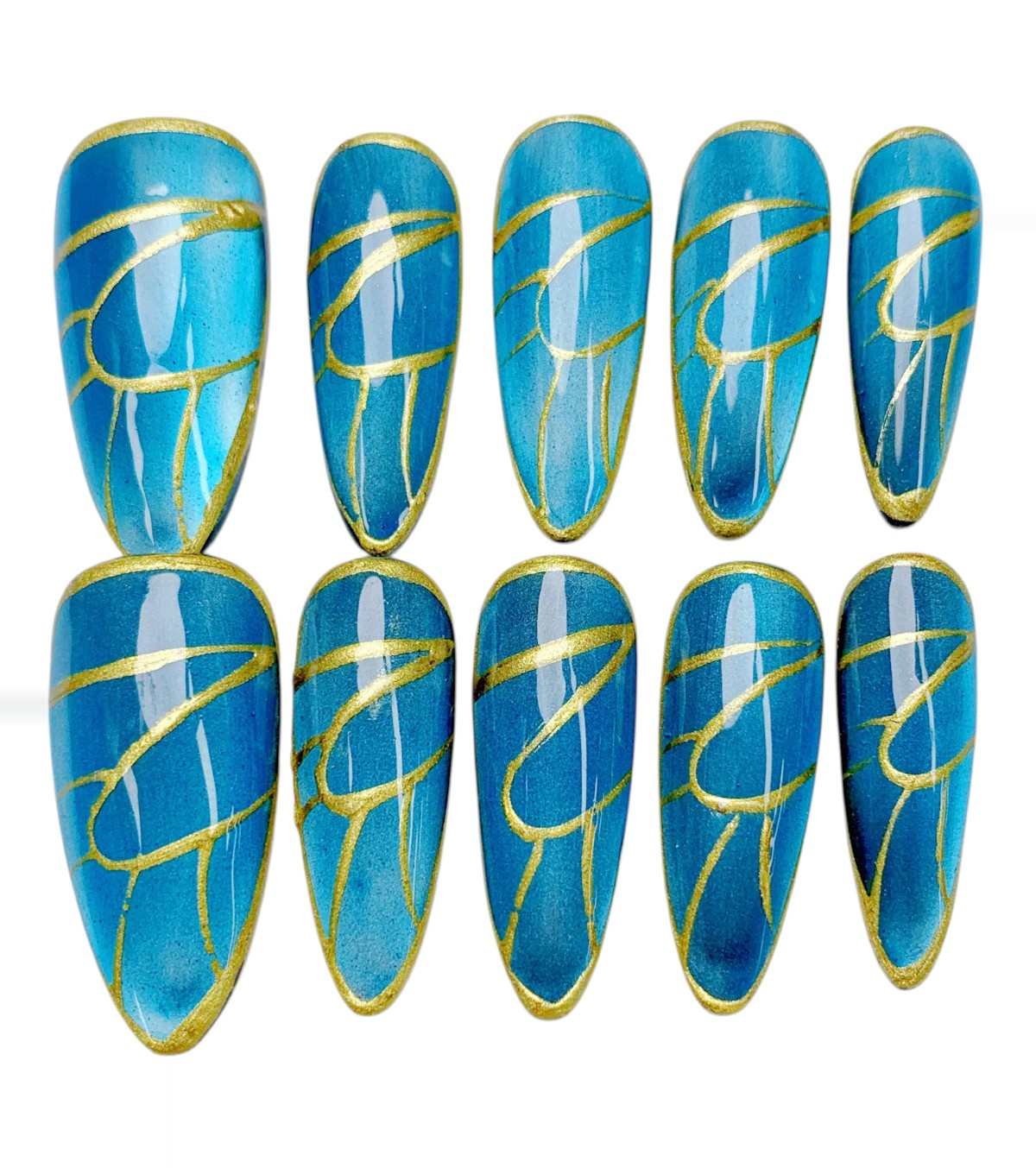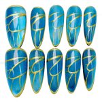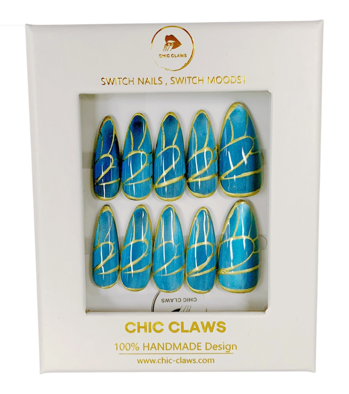 Mit Blue Wave bekommst du elegante Press-on Nägel in strahlendem Blau mit goldenen Linien. Ein glamouröser Look für besondere Anlässe und einfach anzubringen.