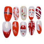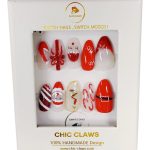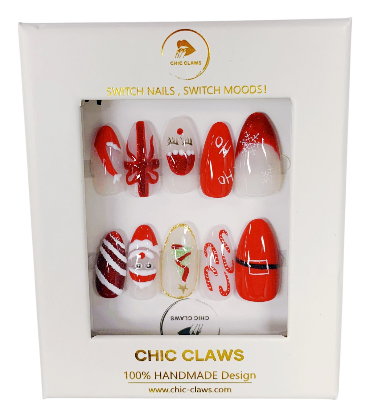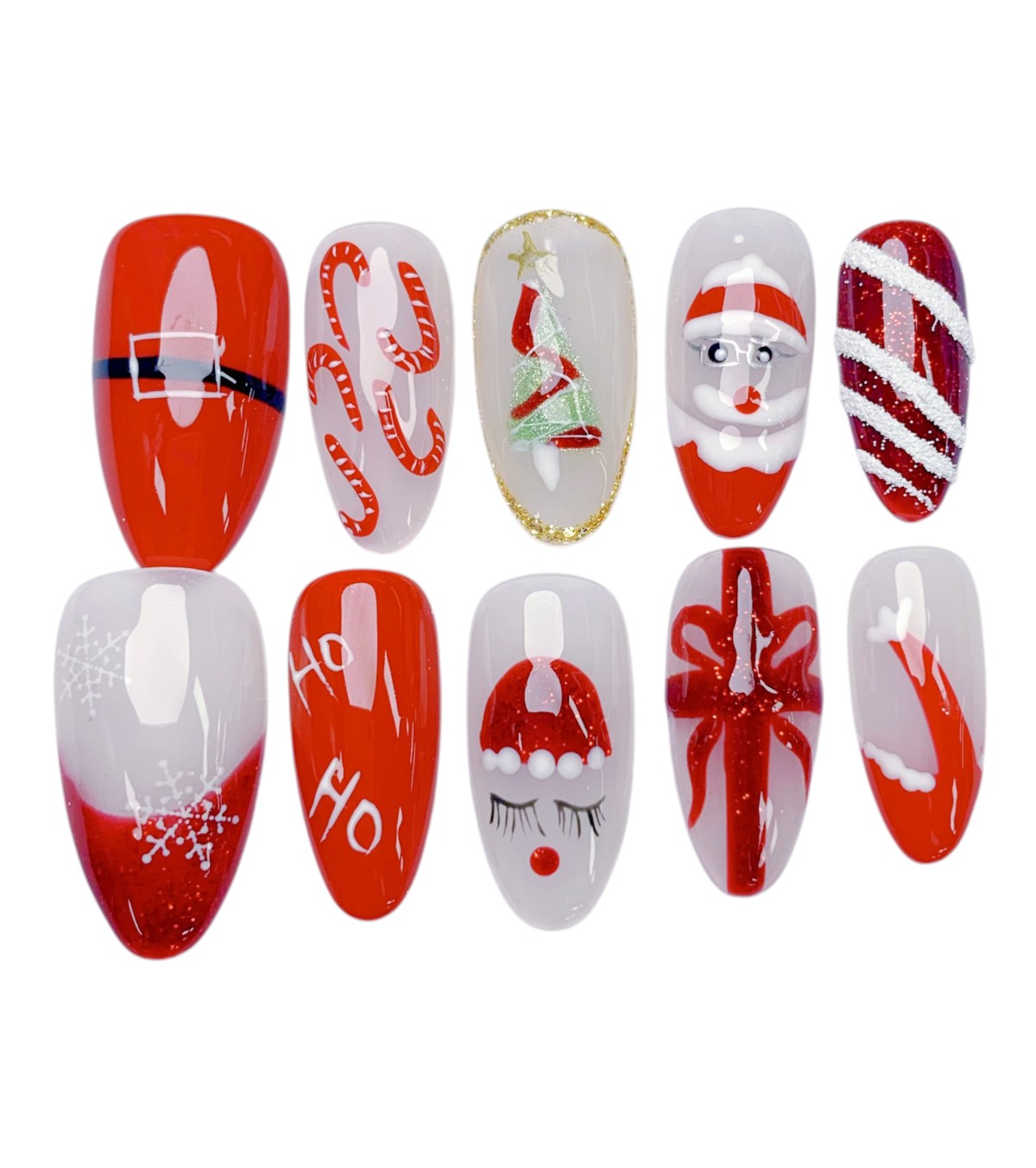 Bringe deine Nägel in Weihnachtsstimmung mit dem Festive Dreams Nageldesign! Diese handgefertigten Press-on Nails vereinen verspielte Weihnachtsmotive wie Zuckerstangen, Geschenke und den Weihnachtsmann in festlichen Rot- und Weißtönen.