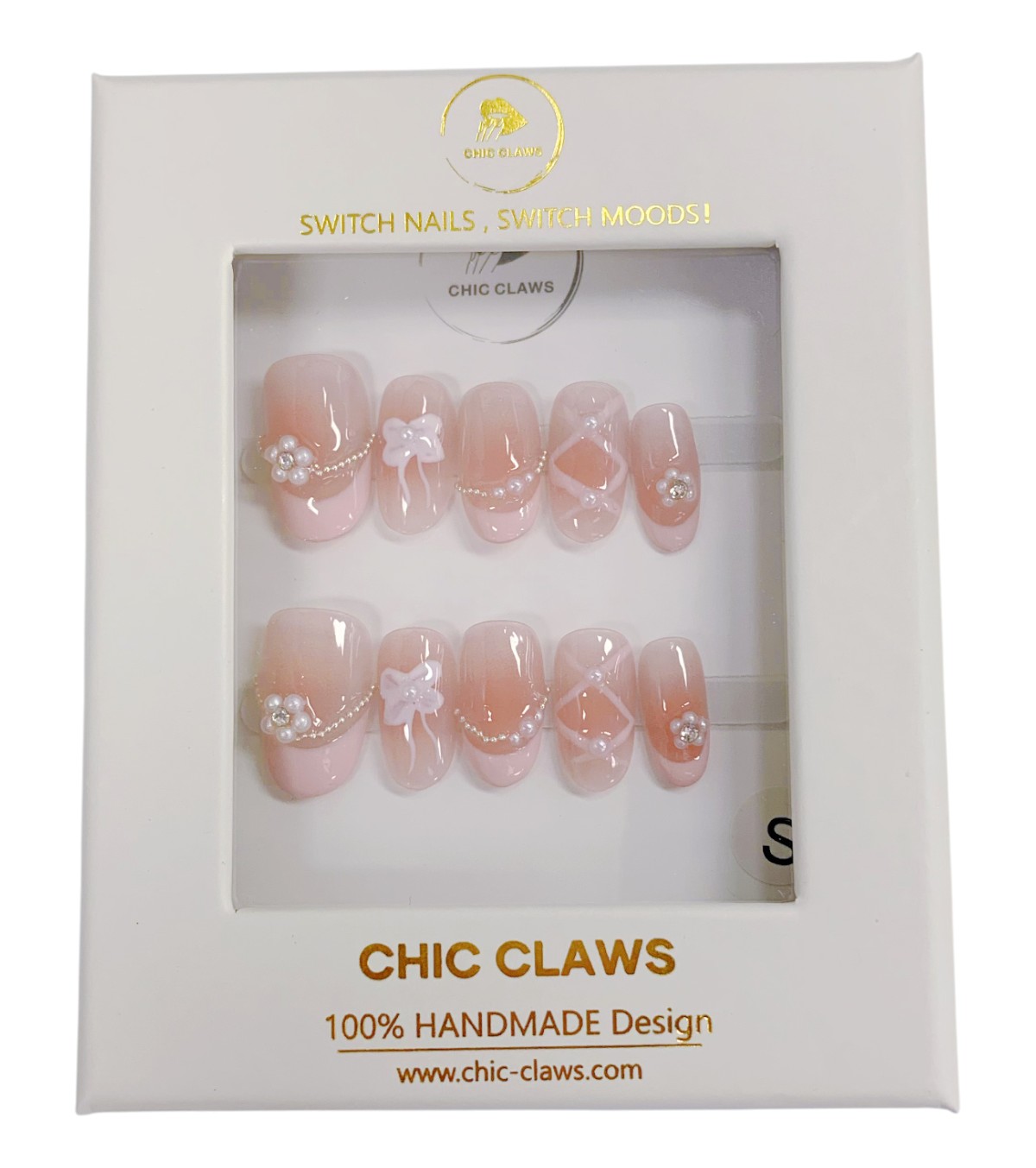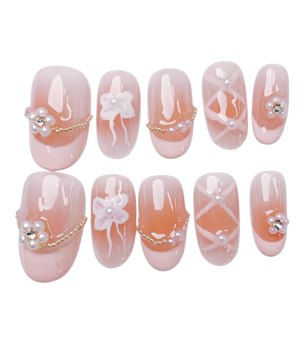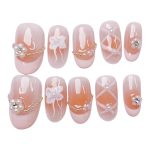 Die Blütenperlen Press-on Nails kombinieren romantische Eleganz mit femininen Akzenten. Zarte Blüten, schimmernde Perlen und dezente Goldlinien verleihen diesem Set einen verspielten, aber gleichzeitig edlen Look.