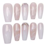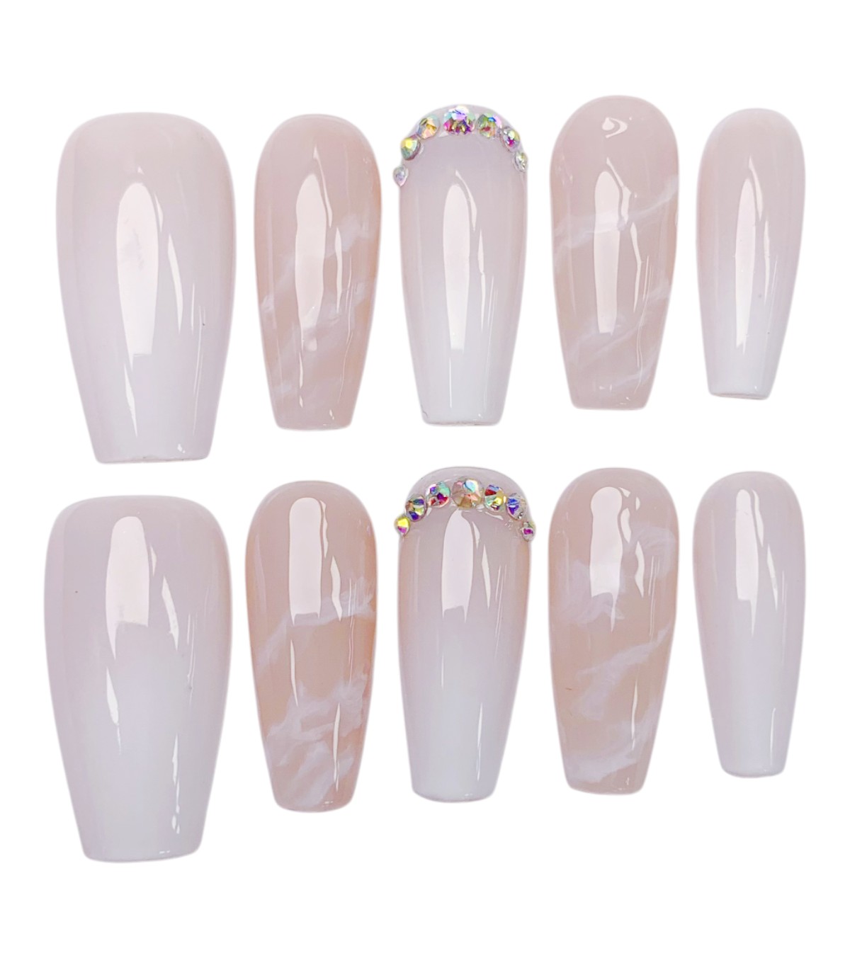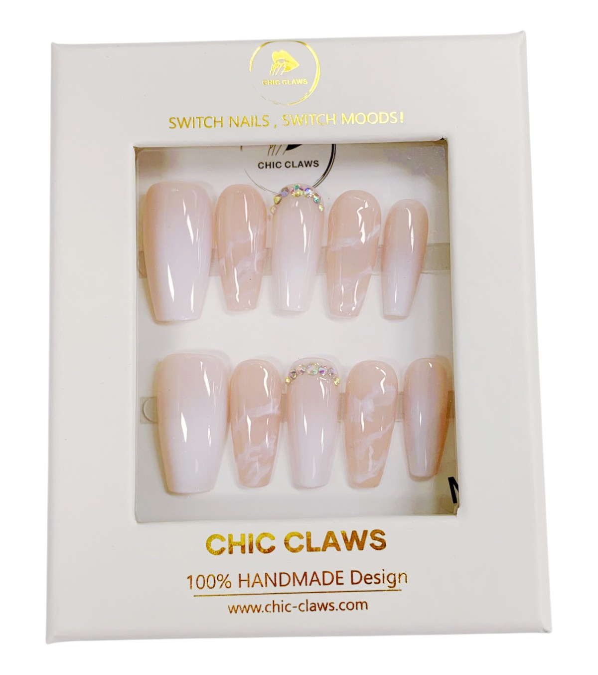 Die Pink Elegance Press-on Nails vereinen dezente Rosatöne mit einem leichten Marmoreffekt und schimmernden Strasssteinen. Perfekt für Hochzeiten, elegante Events oder einfach für den Alltag mit einem Hauch Glamour.