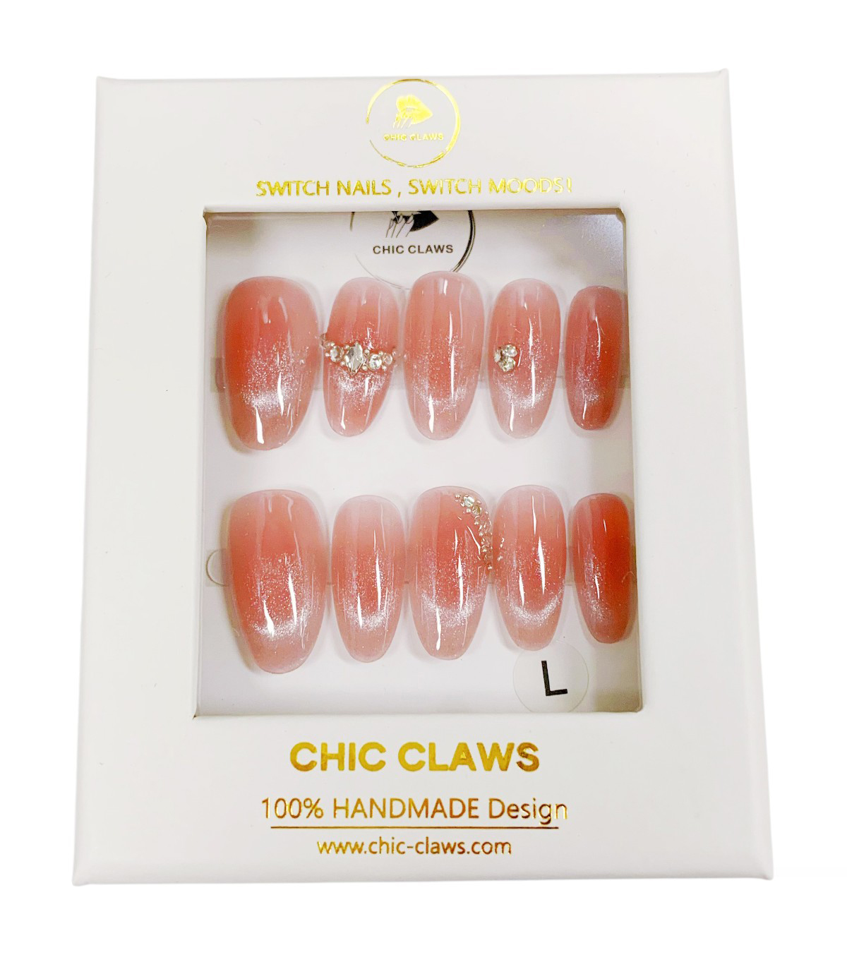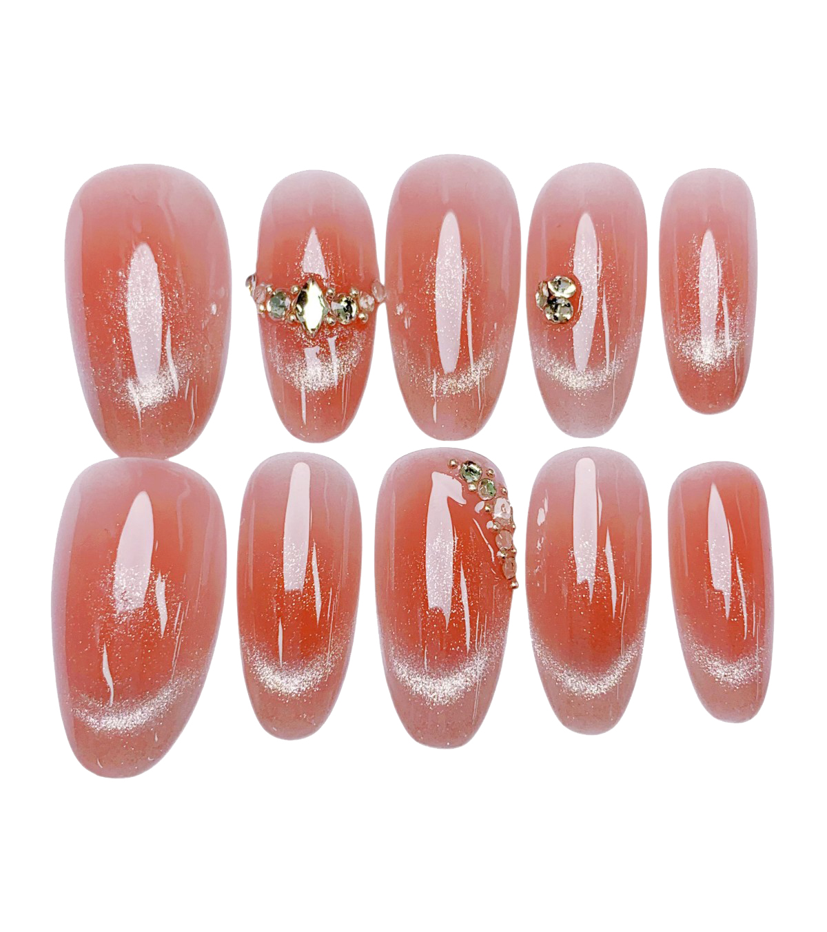 Mit Coral Shine zauberst du einen frischen und eleganten Look auf deine Nägel. Die Press-on Nägel in warmem Korallton mit dezentem Glitzer und zarten Strasssteinen sind perfekt für einen strahlenden Auftritt.