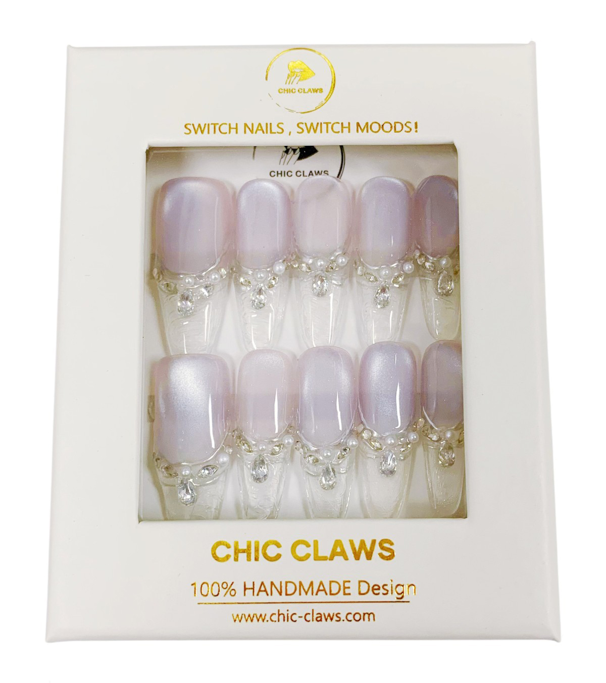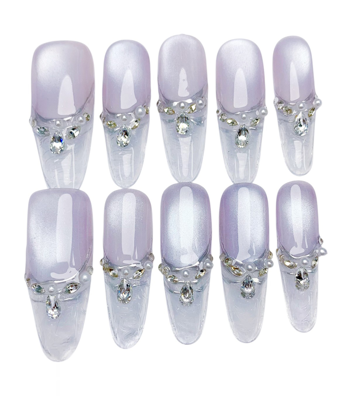 Mit Ice Queen holst du dir den eleganten Winter-Look auf deine Nägel. Das zarte Lavendel-Silber-Design mit funkelnden Strasssteinen verleiht deinen Händen eine glamouröse, eisige Ausstrahlung – perfekt für festliche Anlässe und stylische Winter-Outfits.