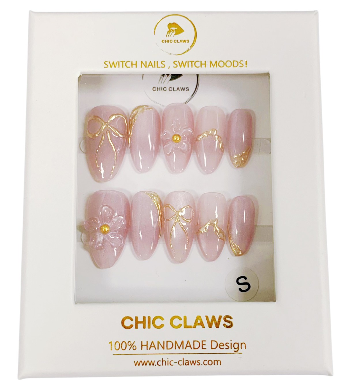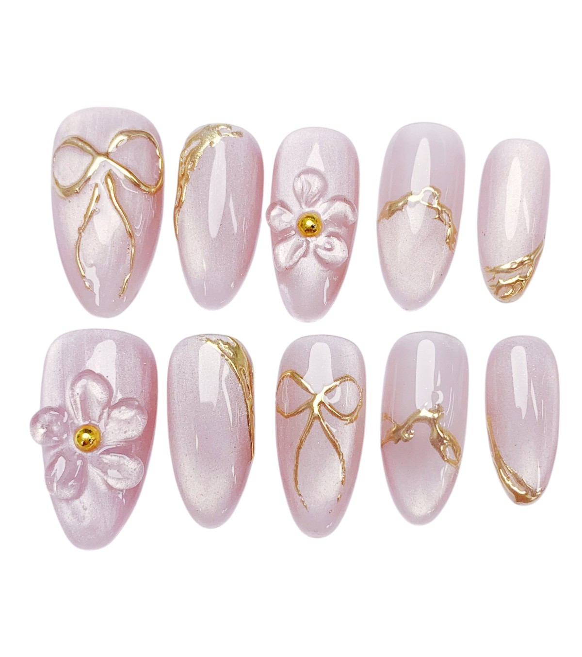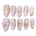 Bringe deine Nägel zum Strahlen mit dem Golden Blossom Nageldesign! Diese handgefertigten Press-on Nails vereinen zarte Rosétöne mit edlen Goldakzenten und filigranen Blütendetails – perfekt für einen femininen und eleganten Look.