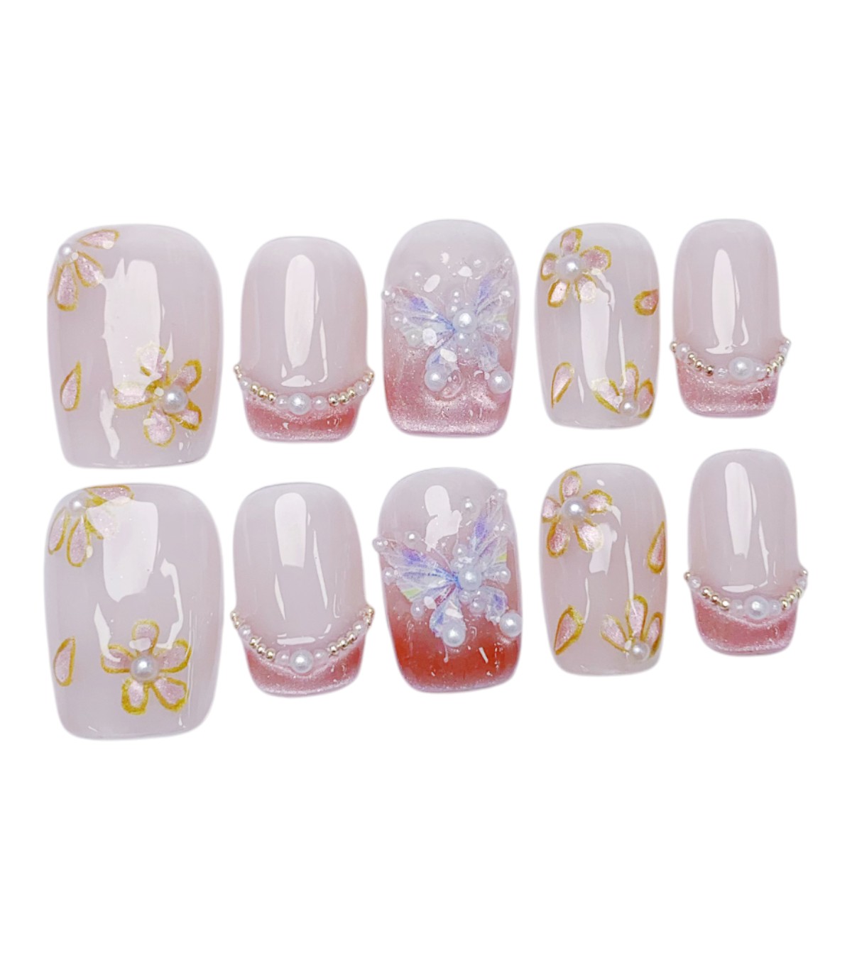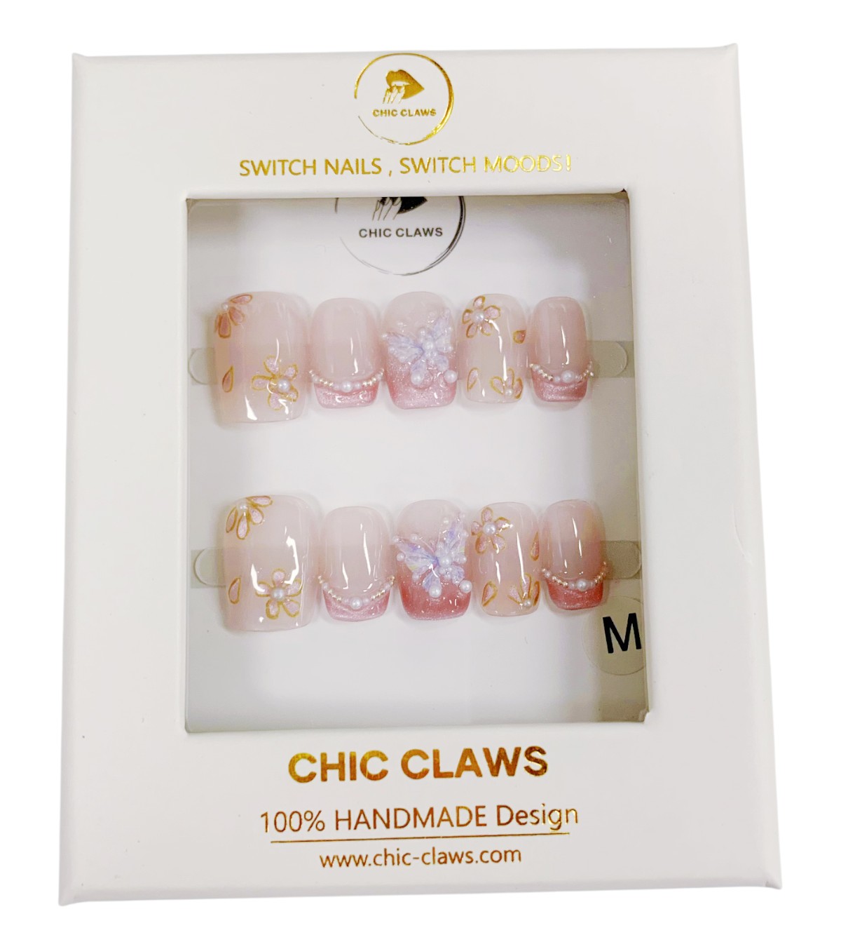 Die handgefertigten Varia Bloom Press-on Nails sind perfekt für alle, die einen romantischen, verspielten Look suchen. Mit zarten Blüten, Perlen und Schmetterlings-Details vereinen sie Eleganz mit einem Hauch von Märchenzauber. Einfach anzuwenden, flexibel und immer ein Blickfang.